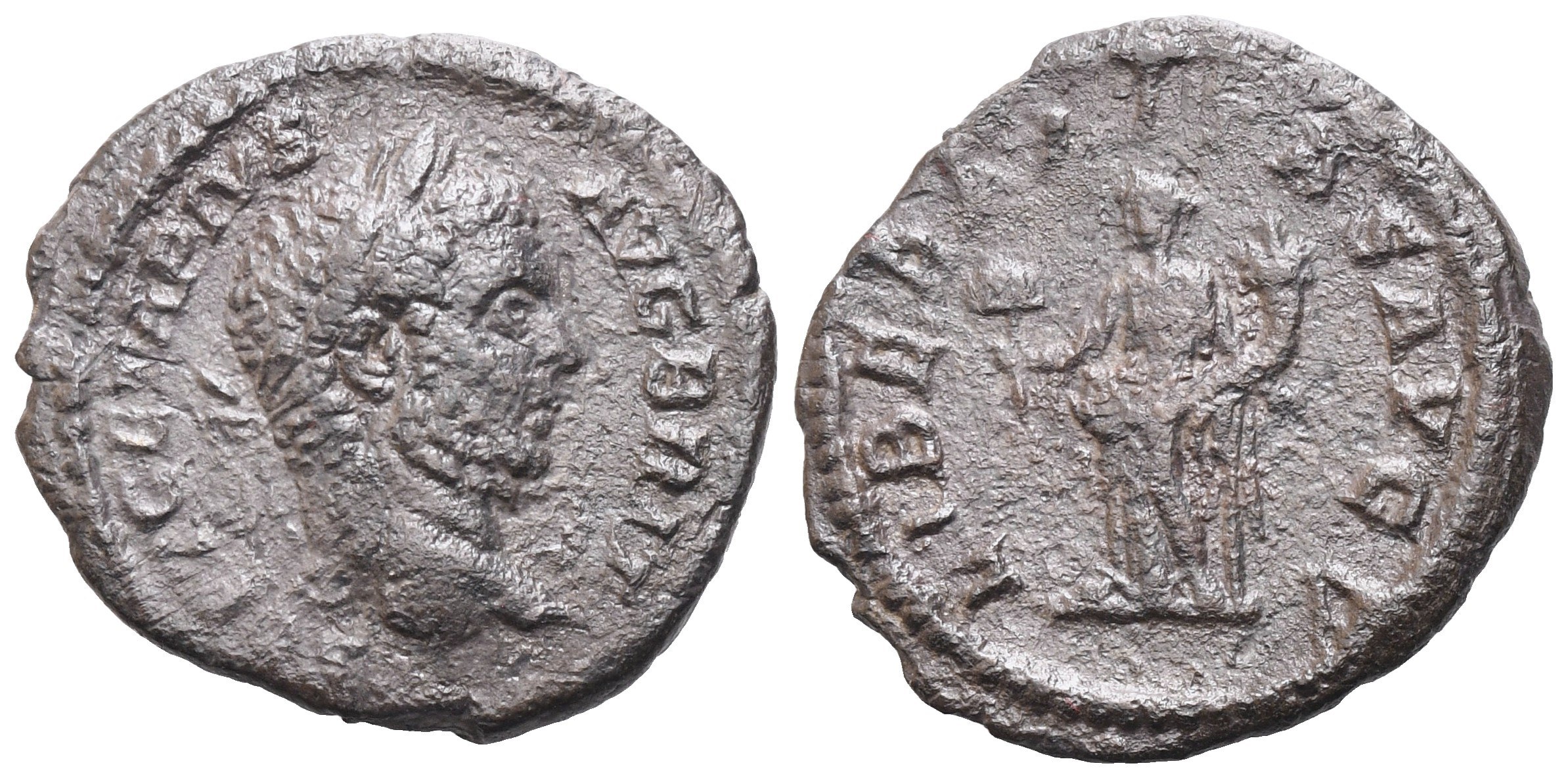 P SEPT GETA PIVS AVG BRIT, laureate head right / LIBERALITAS AVG V, Liberalitas standing left, holding abacus and cornucopia. Cf. RIC IV 88; cf. RSC 68. Dark brown patina. VF