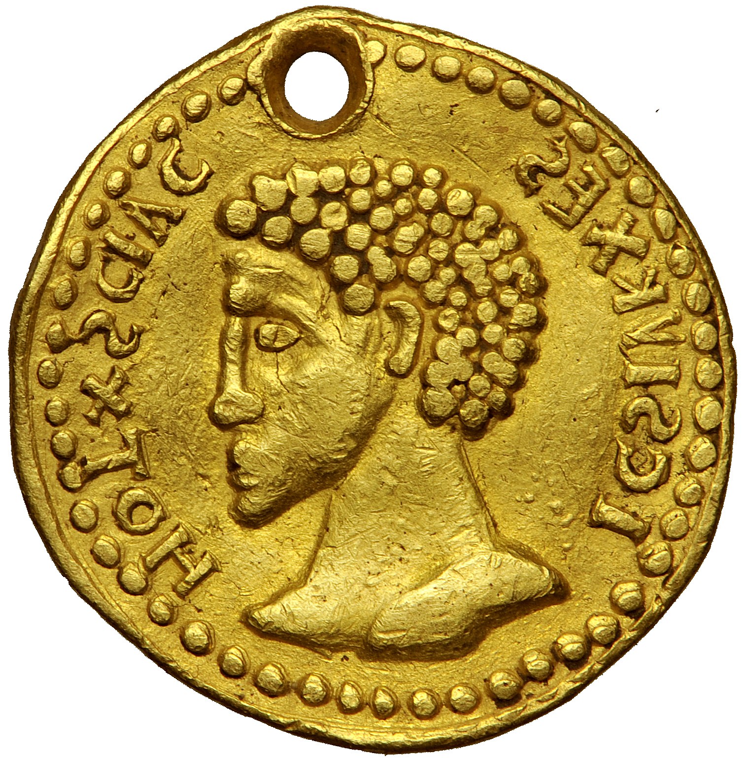 Złoto, 5,37 g, 19,0 mm, oś 11 g. Na godz. 12 okrągły otwór wykonany od strony awersu. por. RIC III s.79 nr 424d (A.Pius dla Marka Aureliusza cezara, lata 140-144, legendy AVRELIVS CAESAR AVG PII F COS / PIETAS AVG) i RIC IV.1 s.212 nr 3 (Septymiusz Sewer dla Karakalli cezara, 196 r., legendy M AVR ANTONINVS CAES / SEVERI AVG PII FIL