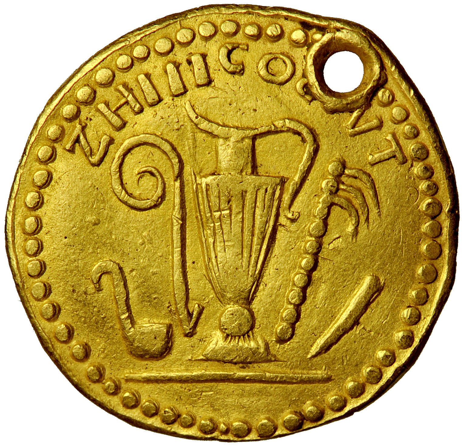 Rv. Akcesoria kapłańskie - czerpak (simpulum), pastorał (lituus), dzban (guttus), kropidło (aspergillum), nóż (secespita). Pseudo-legenda ZHIIICO[?]NT