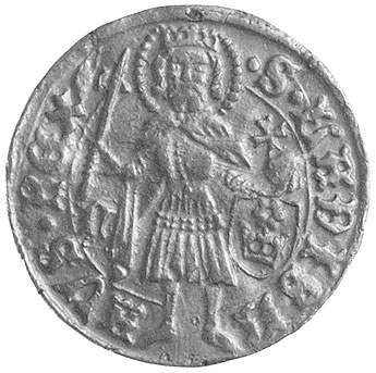 Ładysław V 1453- 1457, goldgulden, Aw: Tarcza herbowa i napis, Rw: Stojący św. Ładysław i napis w otoku; w polu N i znak mincerza, Fr.10, Pohl H 2-9, złoto 3.52 g
