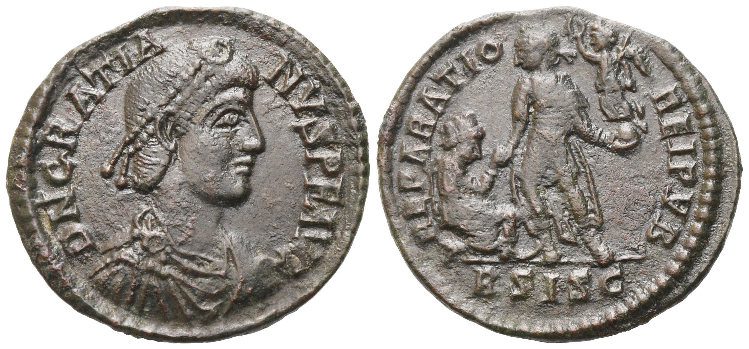 DN GRATIANVS P F AVG Pearl-diademed, draped and cuirassed bust of Gratian to r.; Rv. REPARATIO REI PVB / BSISC· Gratian standing facing, his head turned to l., raising kneeling woman with his r. hand and holding Nike on globe in his l. RIC IX 26a. gVF