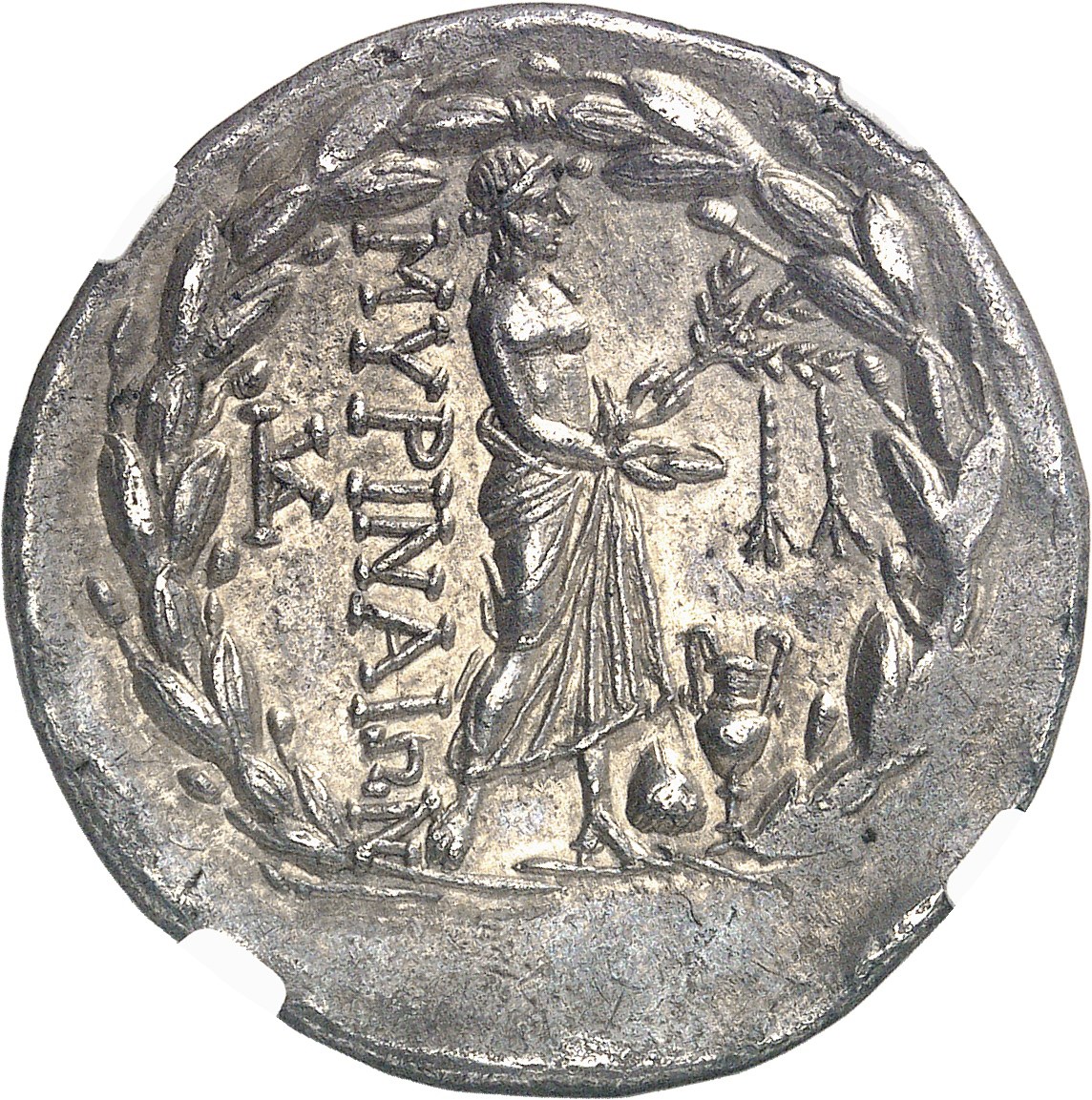 Rv. MYPINAIΩN. Apollon de Crynion vêtu d'un himation, debout à droite, tenant une phiale et une branche de laurier à laquelle sont suspendus deux filets ; à ses pieds, à droite, une amphore et l'omphalos ; dans le champ, à gauche, monogramme ; le tout dans une couronne de laurier.