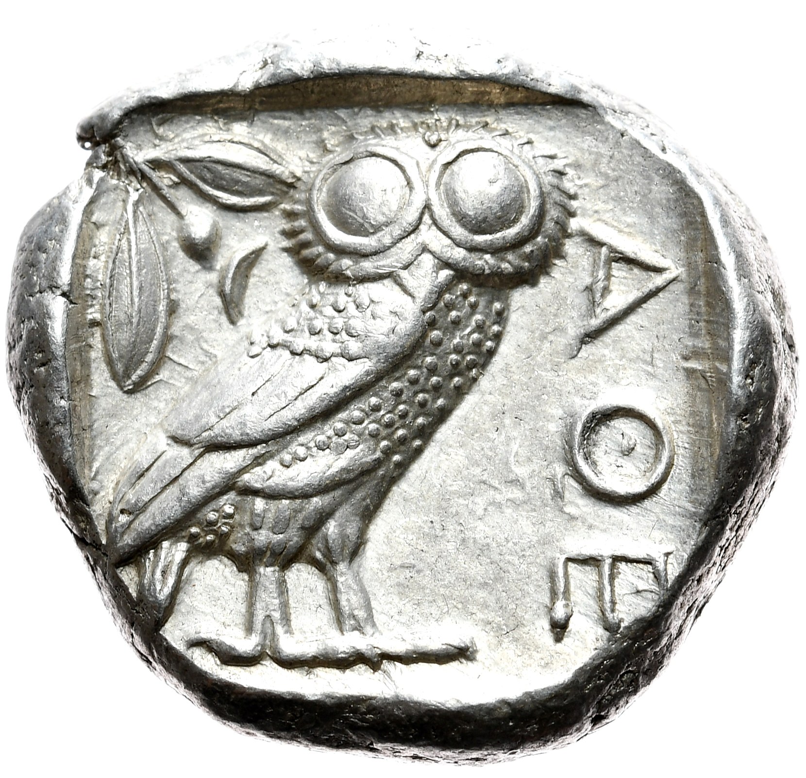 Rewers: sowa stojąca w prawo, z głową zwróconą na wprost, w postawie wyprostowanej, z oliwną gałązką i półksiężycem z tyłu, z prawej strony ΑΘΕ