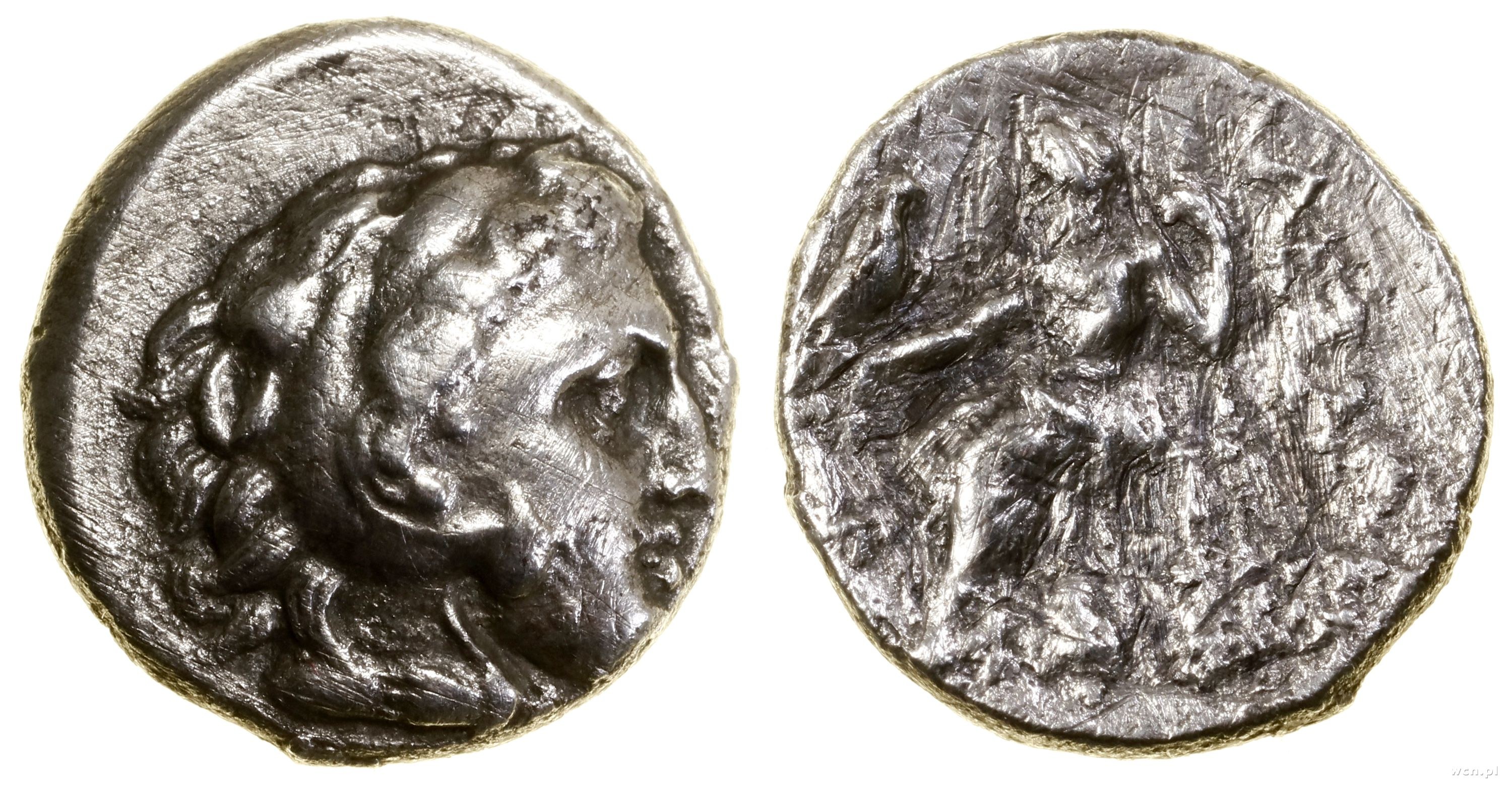 Aw: Głowa Heraklesa nakryta lwią skórą w prawo; Rw: Zeus siedzący na tronie w lewo, trzymający orła i berło