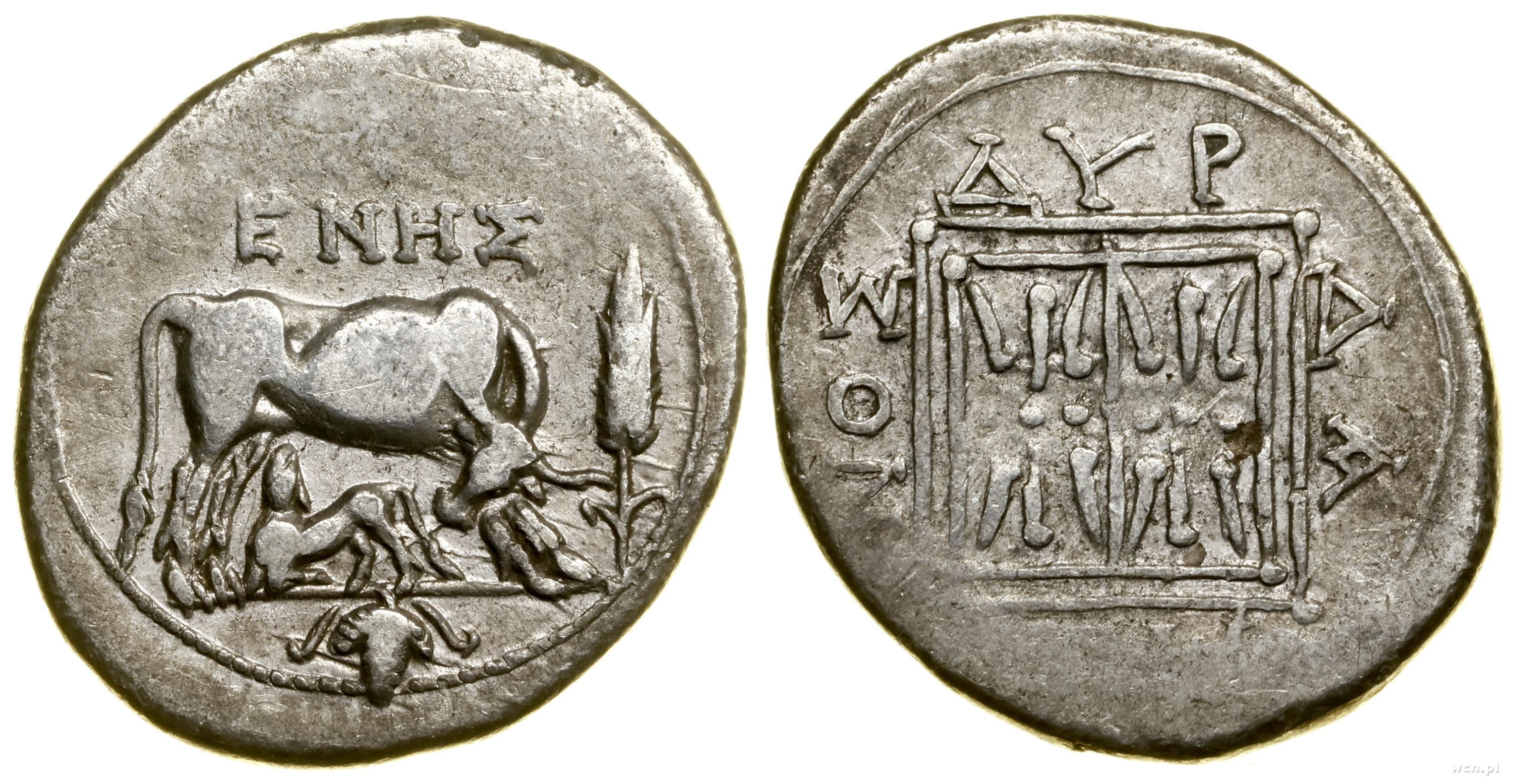 Aw: Krowa stojąca w prawo, karmiąca cielę, powyżej [ΠEPI] / ΓENHΣ, z prawej kłos zboża, Rw: Ornamenty kwiatowe w podwójnej kwadratowej ramce, po bokach ΔYP / ΔA / [MH] / NOΣ