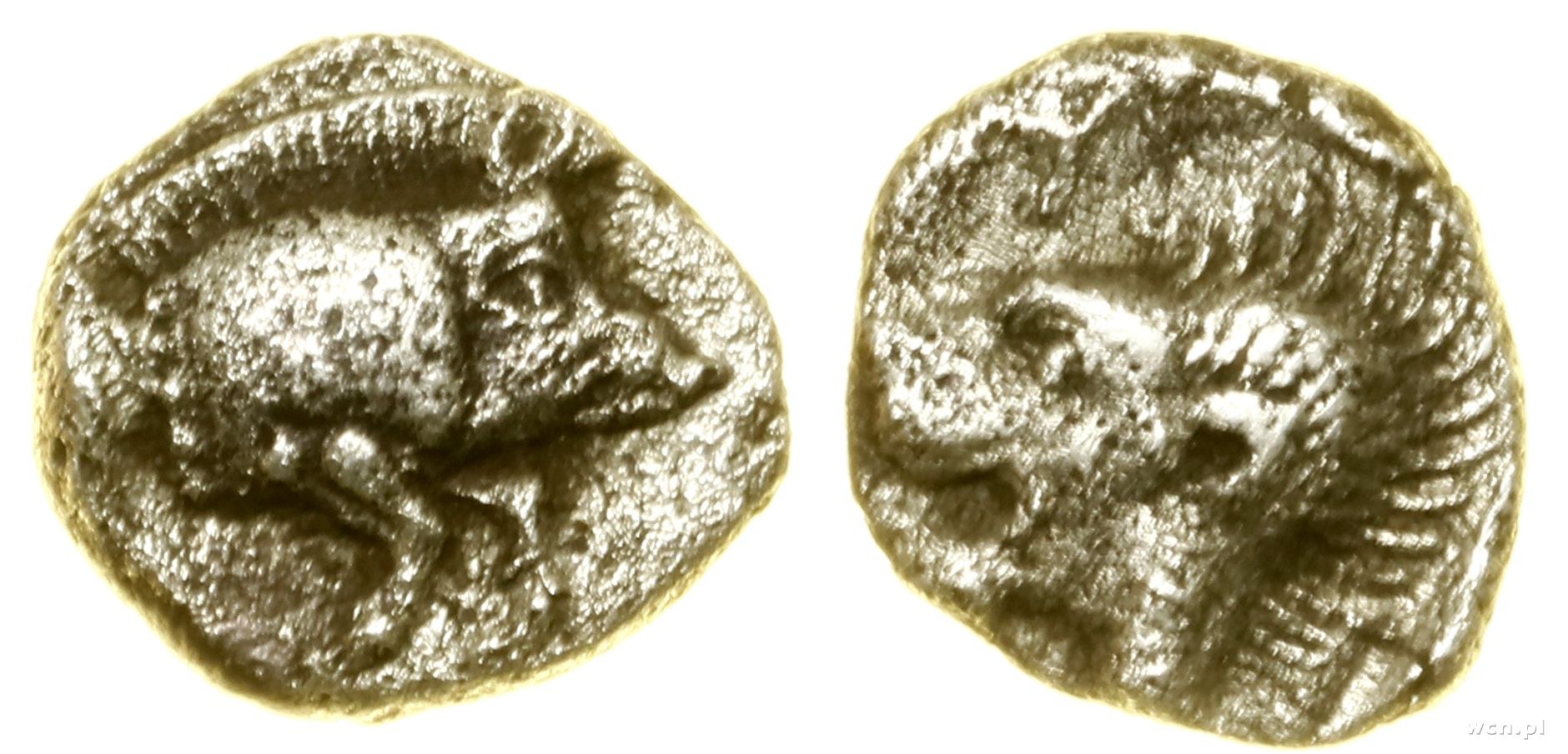 Aw: Proton dzika w prawo, Rw: W kwadracie incusum głowa lwa w lewo, nad nią odwrócona litera K