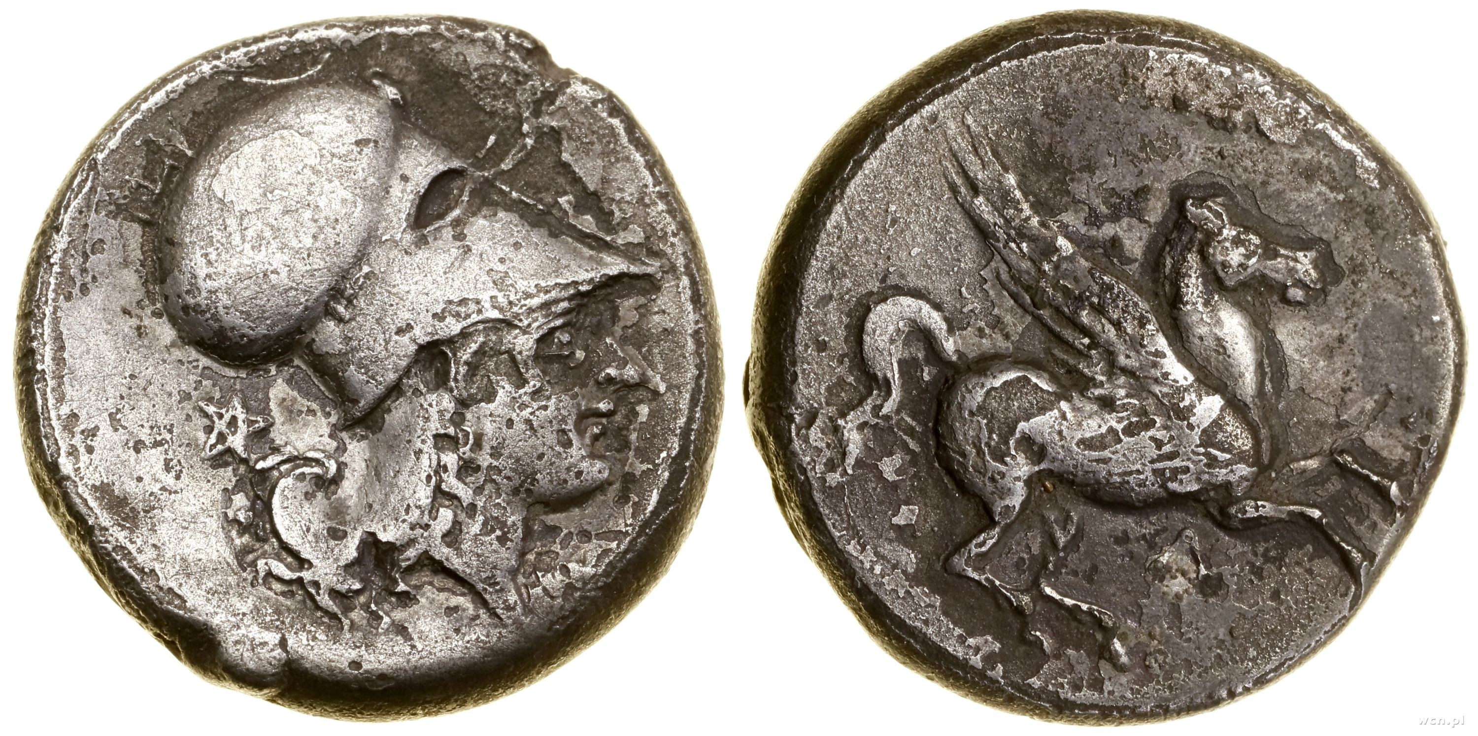 Aw: Pegaz lecący w prawo, poniżej znak Λ, Rw: Głowa Ateny w hełmie korynckim w prawo, z lewej pentagram