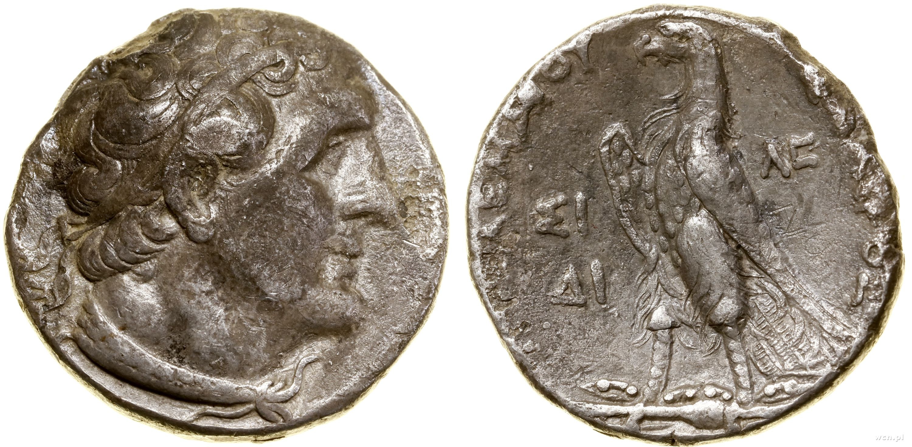Aw: Głowa Ptolemeusza w prawo, Rw: Orzeł stojący na piorunie i napis [ΠΤΟΛΕΜΑΙΟΥ ΒΑΣΙΛΕΩΣ], po bokach Orła ΣΙ / ΔΙ oraz ΛΣ