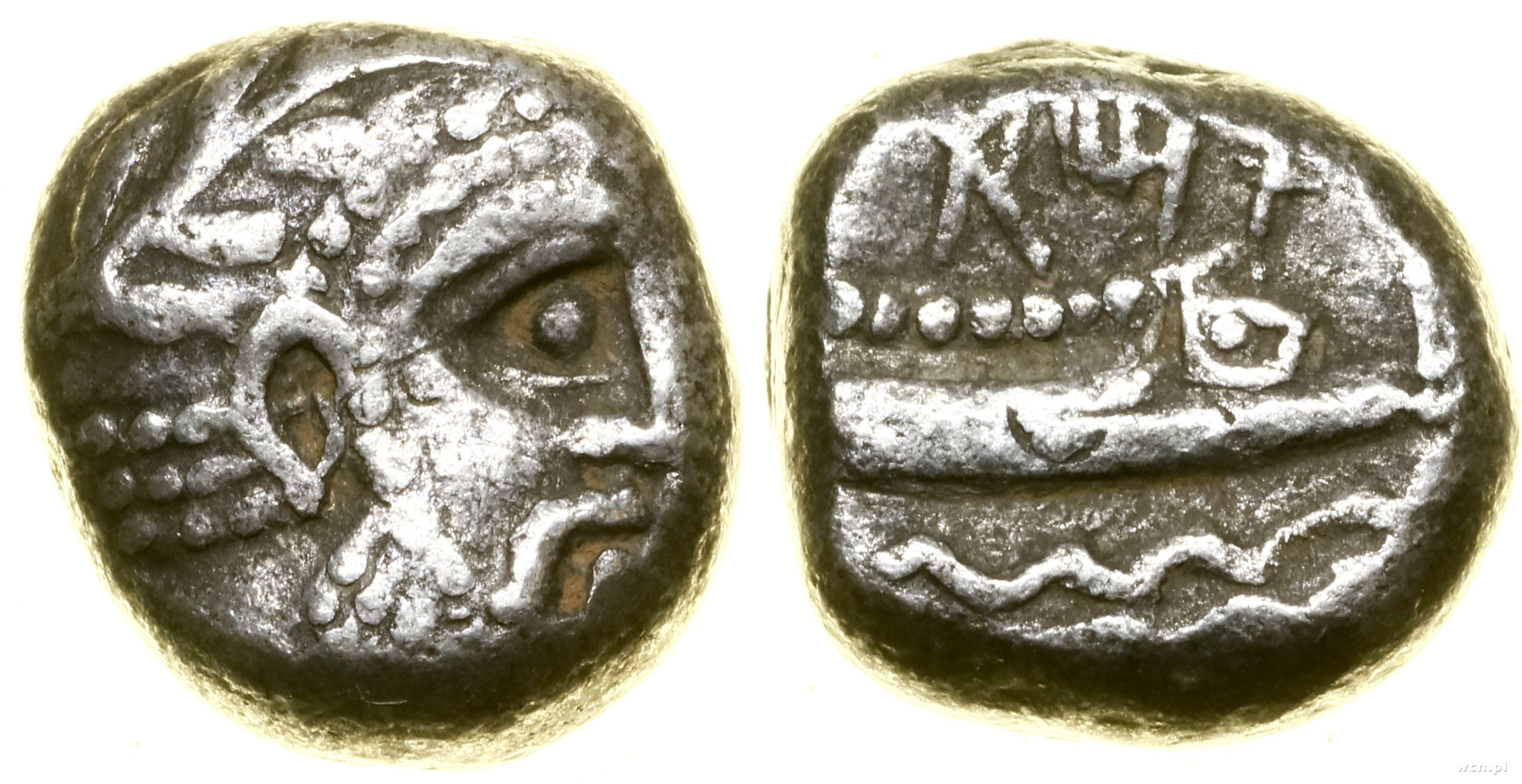 Aw: Brodata głowa w prawo, Rw: Galera w prawo, poniżej fale, powyżej fenicka inskrypcja