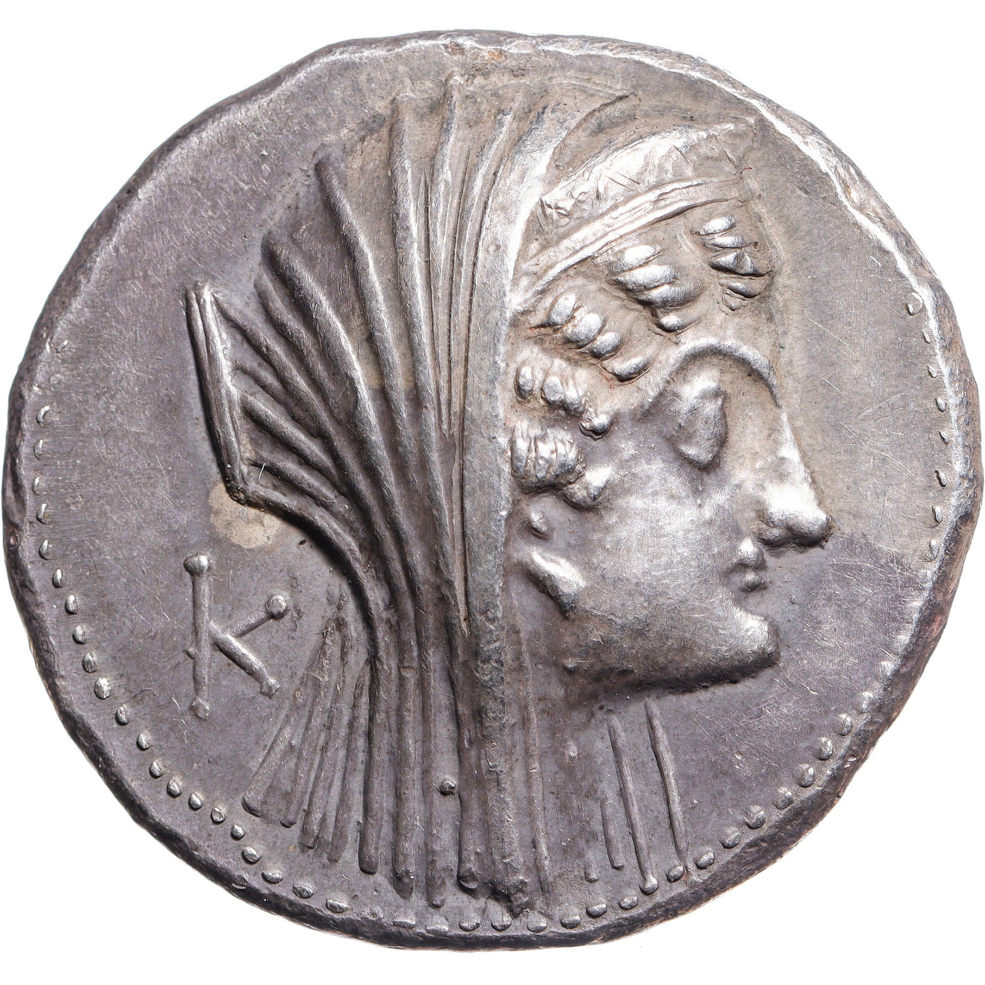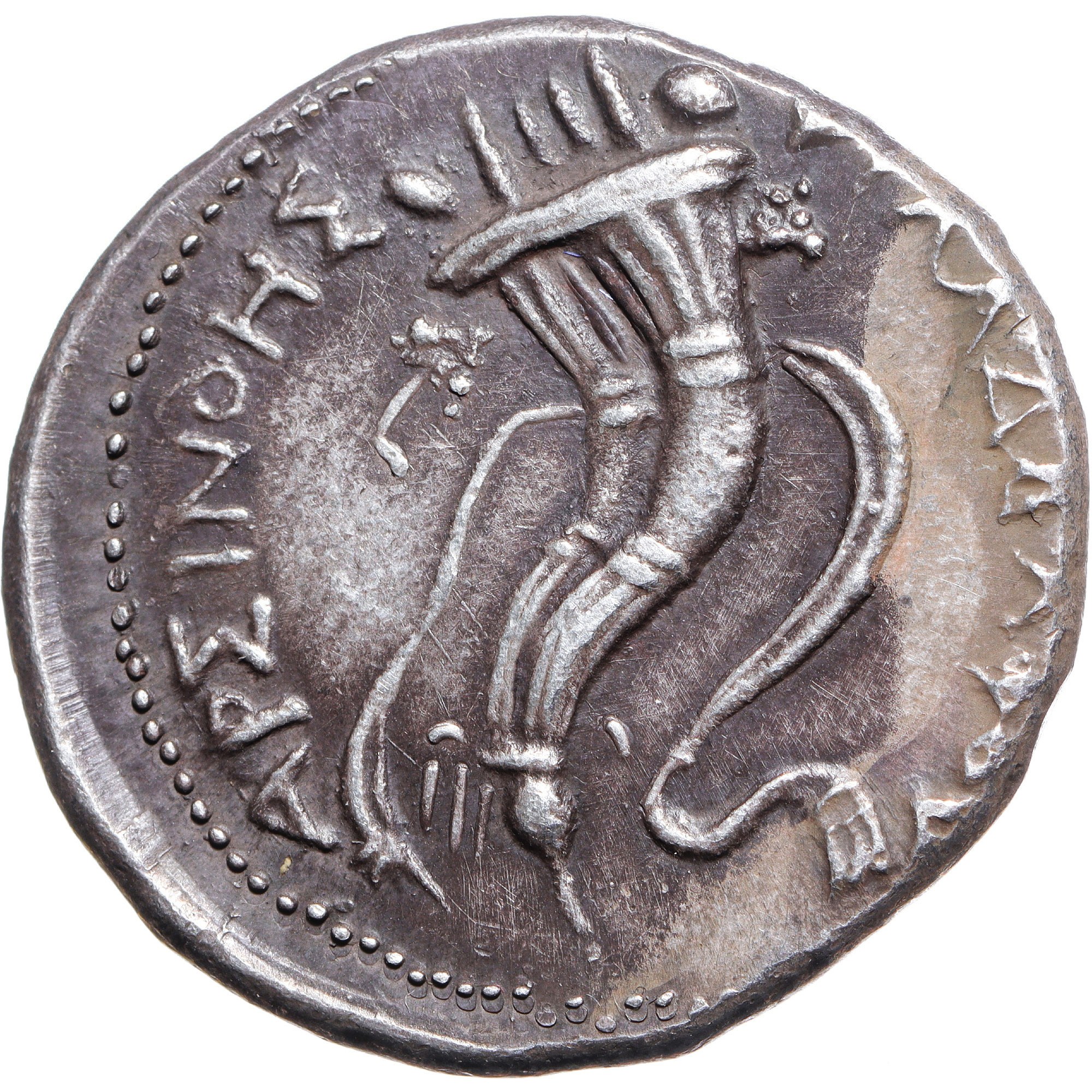 Head right with ram's horn, veiled and wearing stephane; lotus-tipped scepter in background, K to left / APΣINOHΣ ΦIΛAΔEΛΦOY, double cornucopia, grape bunches hanging at sides, bound with fillet.