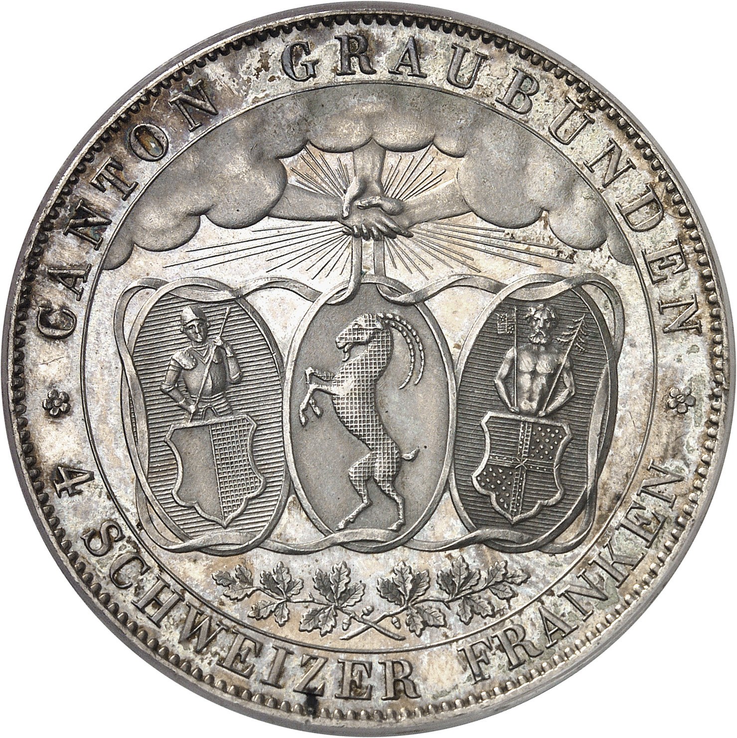 PCGS MS64 (5476981). Av. * CANTON GRAUBUNDEN */ 4 SCHWEIZER FRANKEN. Armes du canton des Grisons sous trois mains sortant des nuées. Rv. EIDGENÖSSISCHES FREISCHIESSEN IN CHUR / (date). Écu posé sur deux carabines et quatre drapeaux en sautoir.