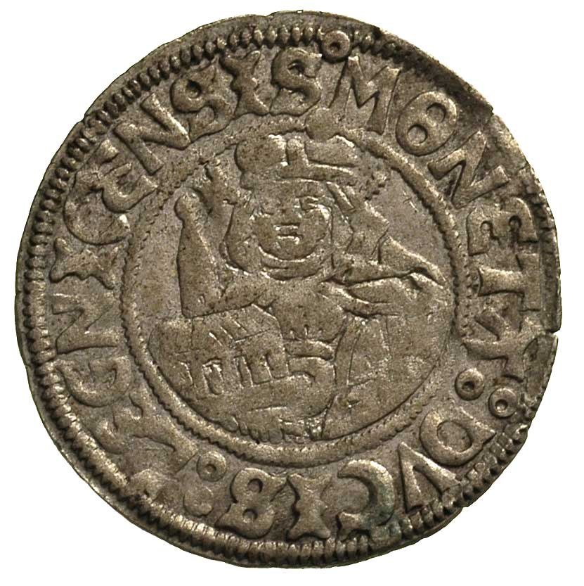 Fryderyk II 1505-1547, grosz, Aw: Orzeł śląski i napis FRIDERICVS DG DVX SILESIE, Rw: Półpostać św. Jadwigi z budynkiem kościoła w dłoniach i napis MONETA DVCIS LEGNICENSIS, Fbg 188 (599), rzadki, patyna