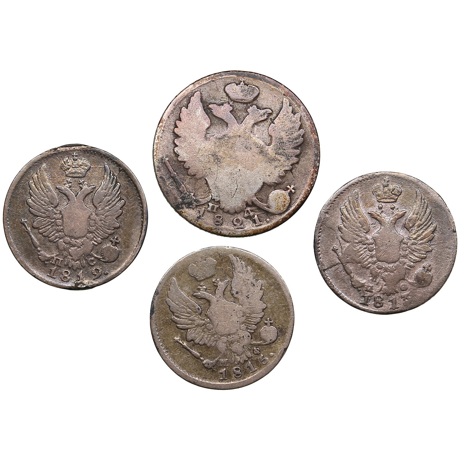 Various condition. Included: 5 Kopecks 1813 ПС, 1815 МФ, 1819 ПС; 10 Kopecks 1821 ПД. Sold as seen, no returns.