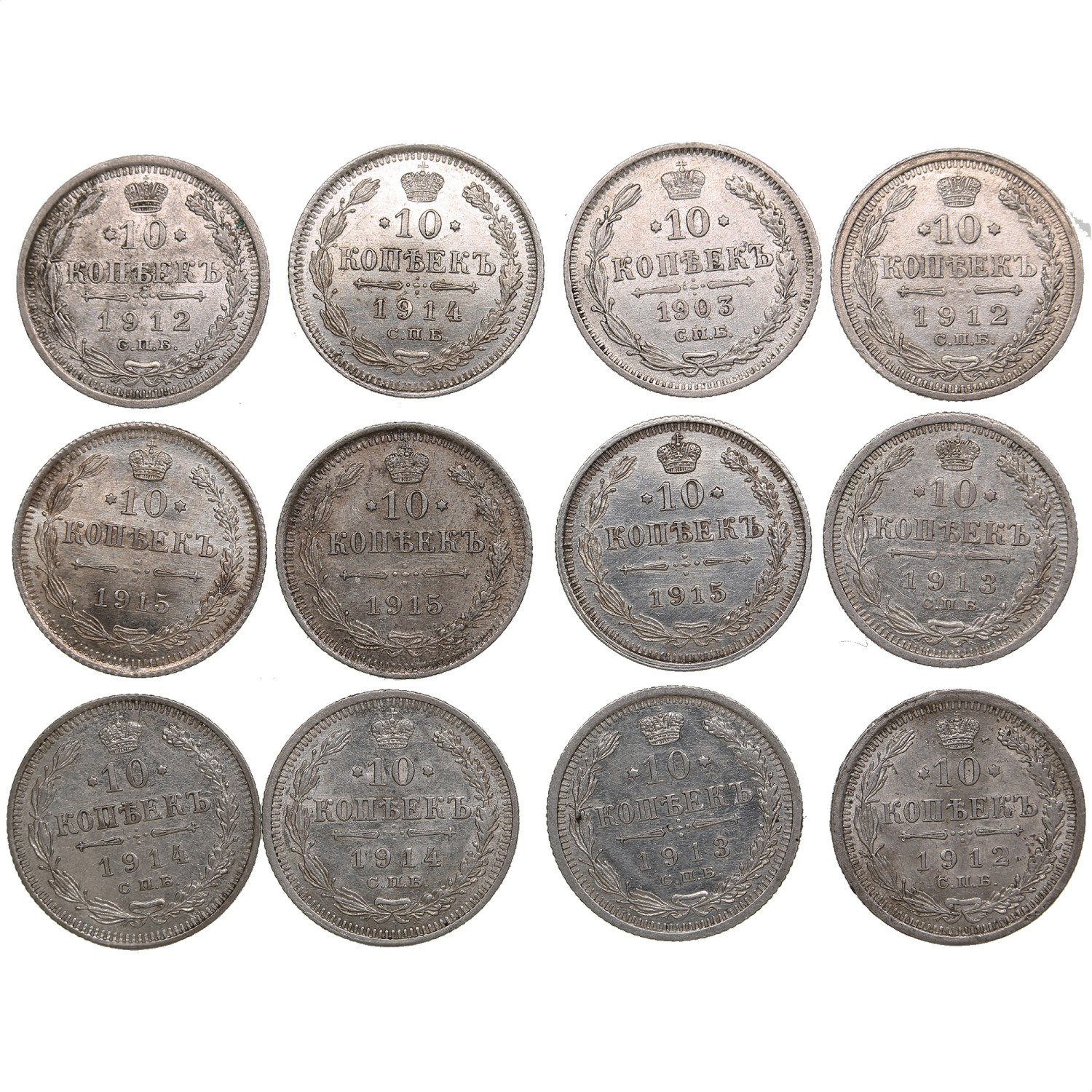 Group of Russian 10 Kopecks (12) - Nicholas II (1894-1917)