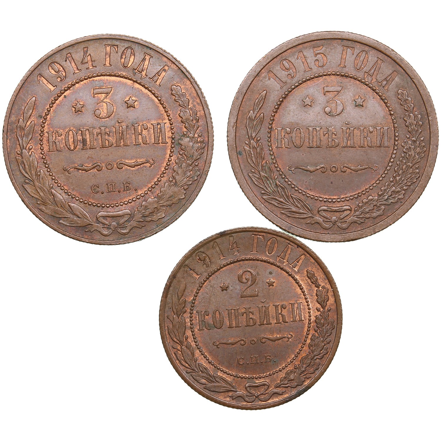 Various condition. Attractive exemplars with traces of red mint luster. Included: 3 Kopecks 1914, 1915; 2 kopecks 1914. Sold as seen, no returns.