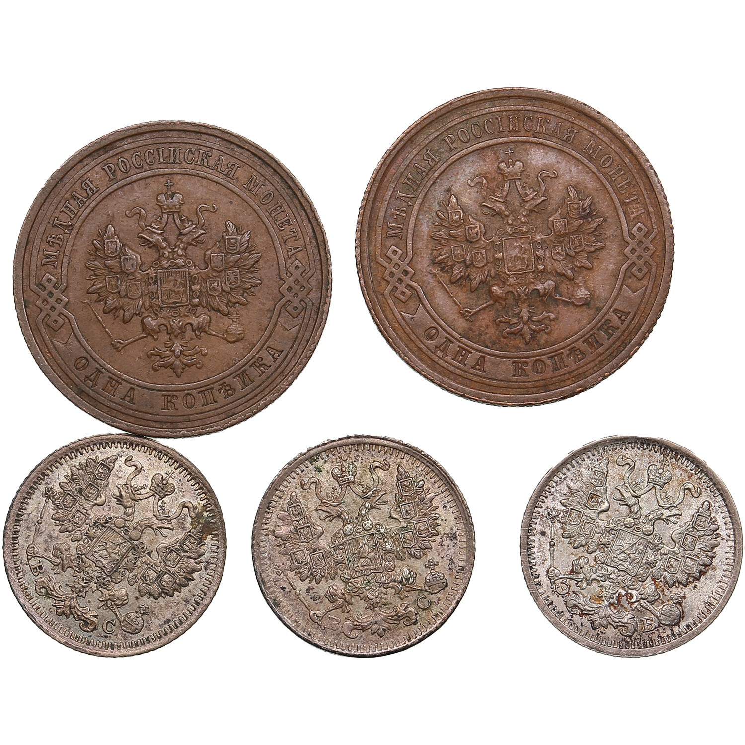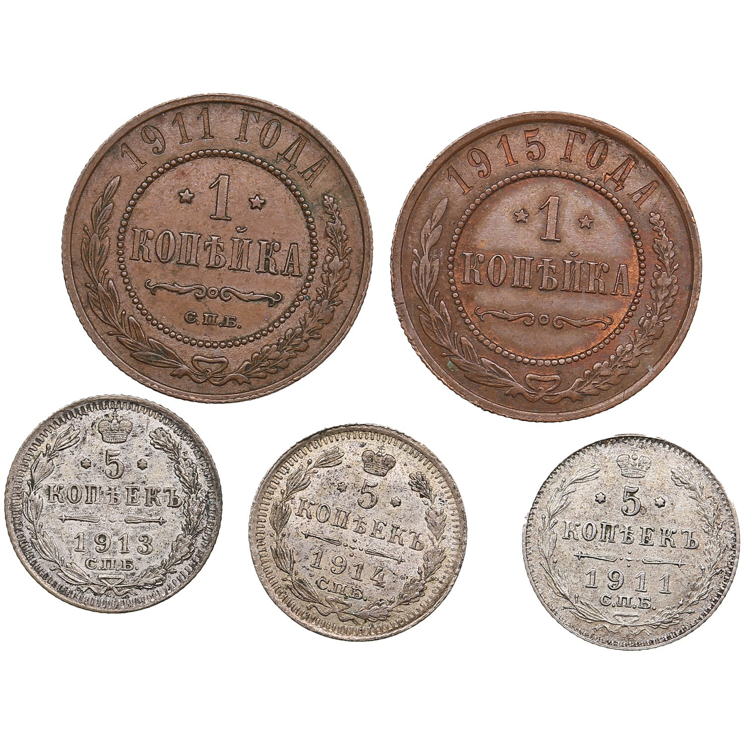 AU-UNC. Included: Copper 1 Kopecks 1911, 1915; Silver 5 Kopecks 1911, 1913, 1914. Sold as seen, no returns.