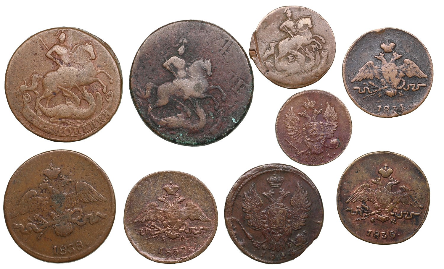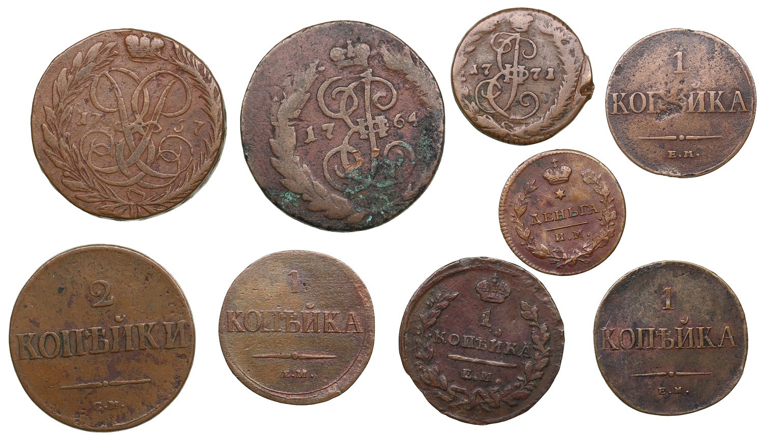 Mixed condition. Sold as-is, no returns. Included: 2 Kopecks 1757 (denomination under horseman, Ekaterinburg edge, rare), 1764 СПМ; 1838 CM; Kopeck 1823 EM-ФГ, 1834 EM-ФХ, 1835 EM-ФХ, 1837 EM-HA; Denga (1/2 Kopeck) 1771 EM, 1811 ИМ-МК (nice state of preservation).