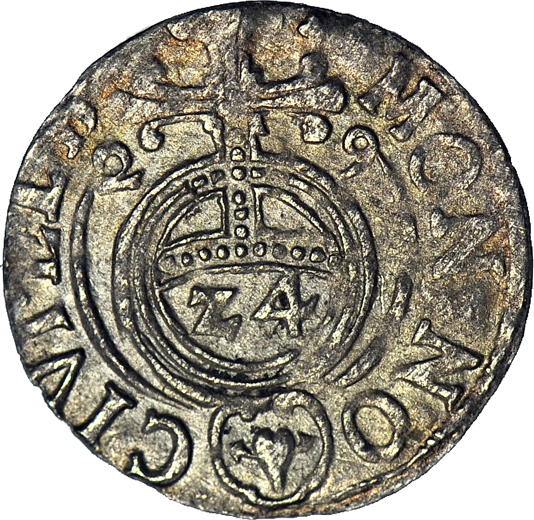 Półtorak z czasów okupacji szwedzkiej Elbląga przez Gustawa Adolfa. Ładnie zachowany jak na tę półfałszerską emisję bitą w pośpiechu i niedbale. Centryczne bicie, dobry detal, połysk w tle. Piękny egzemplarz.