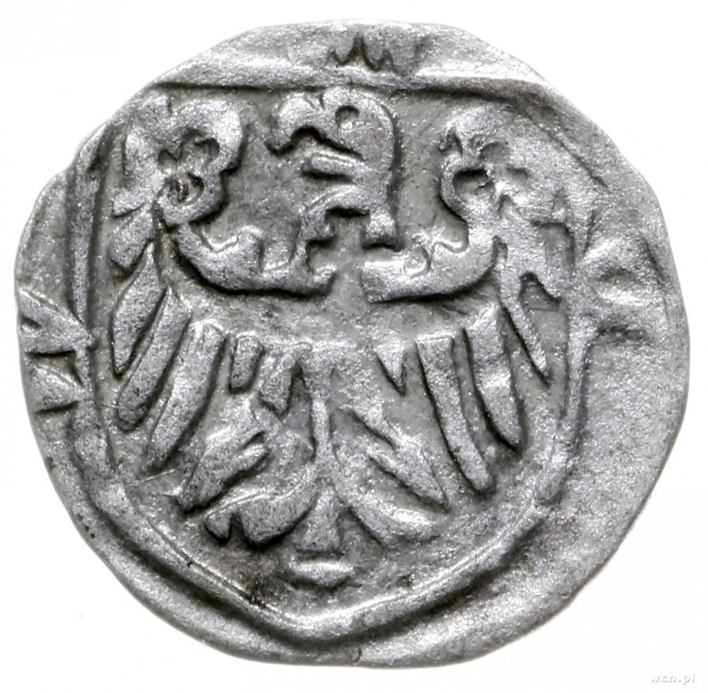 Ks. Oleśnickie, Konrad VIII Młodszy 1416-1444/1447, halerz miejski ok. 1430-1440, Wołów, Aw: Głowa wołu na wprost w obwódce, wokoło M*WM*W; Rw: Orzeł piastowski na wprost w tarczy, wokoło MCW; Fbg 309 var, Kop. 8750, BRP GŚl s.197, Frynas S.Wol.1.2; srebro 0.31 g, ładnie zachowany