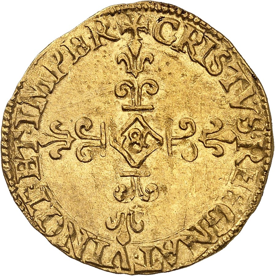 Les écus d’Or d’Henri III frappés à Aix-en-Provence sont frappés pour presque toutes les années, mais dans des proportions très réduites et sont très rares, ou non retrouvés. Notre exemplaire, ainsi que deux autres exemplaires connus de 1577 (vente Palombo 9 n° 126) ou de 1589 (vente Künker 251 n° 3025), montrent que l’atelier fabrique au 1er type (chez Gadoury mais 2e type de Duplessy) avec le revers au losange au centre de la croix qui contient la lettre d’atelier. À notre connaissance, les millésimes 1575 (635 ex. fabriqués), 1576 (826 ex.), 1578 (1947 ex.), 1579 (630 ex.), 1581 (250 ex.), 1582 (660 ex.), 1583 (504 ex.), 1584 (414 ex.), 1585 (700 ex.), 1586 (240 ex.) ou 1588 (497 ex.) ne sont pas retrouvés