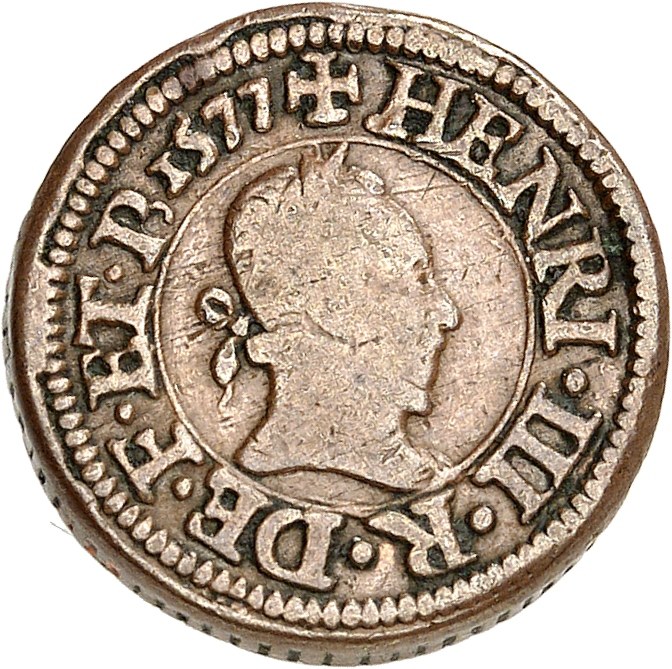 Av. (à 12 h) + HENRI. III. R. DE. F. ET. P. (date). Buste lauré et cuirassé à droite.