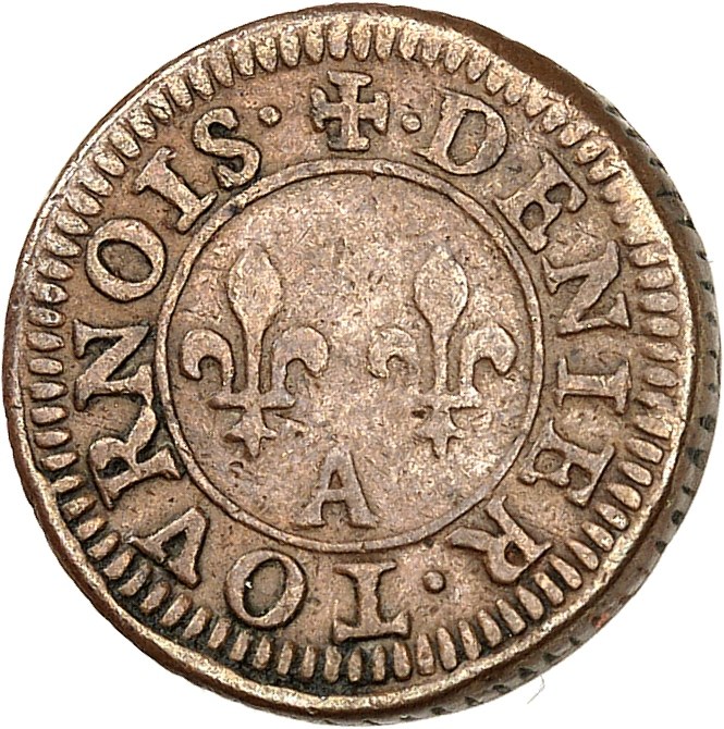 Rv. (à 12 h) + DENIER. TOVRNOIS. Deux lis et (atelier) posés deux et un.