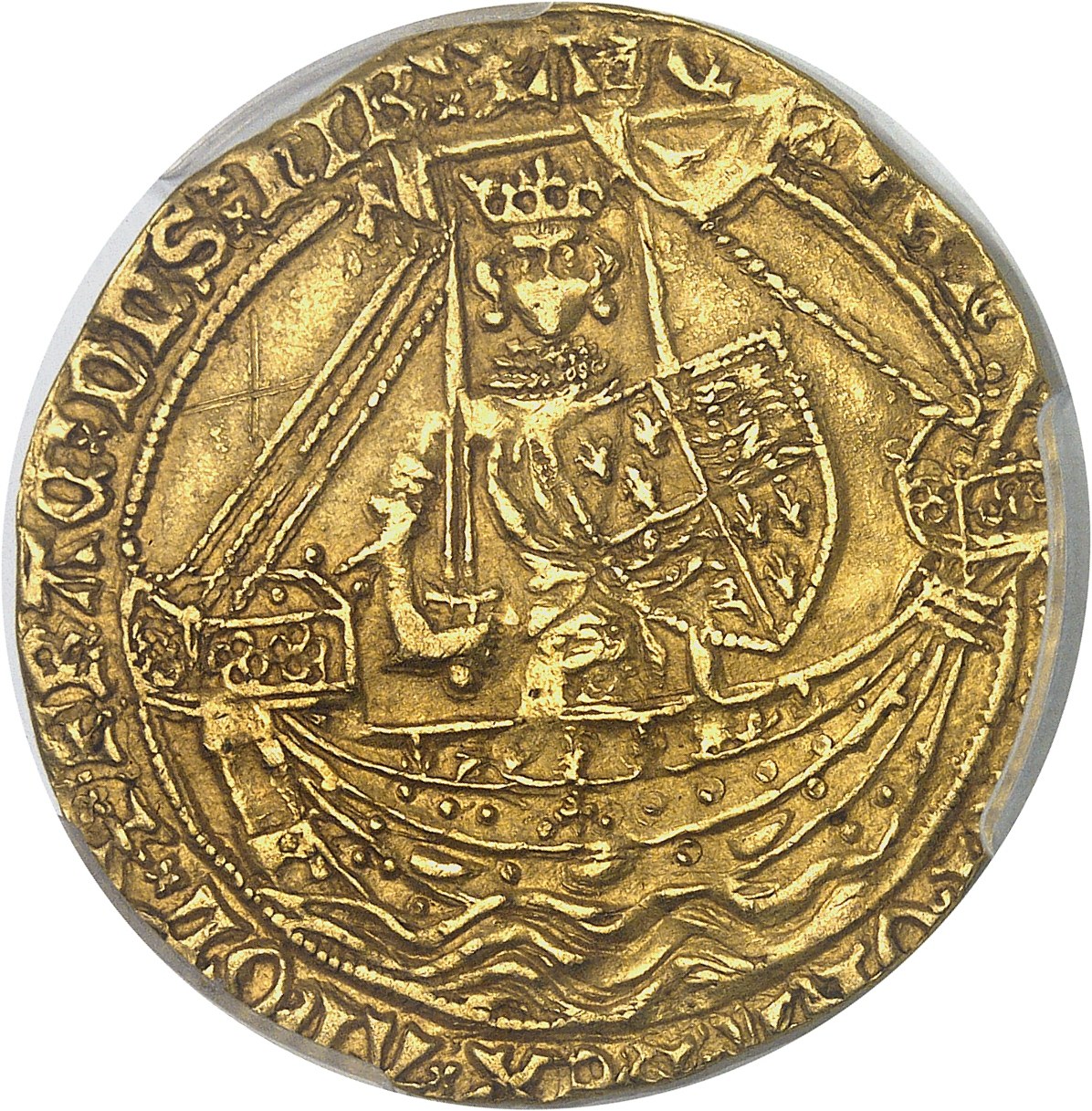 Av. HEN- RIC’x DI’x GRA’x REXx ANGL'x Zx FRAC'x DNSx HYB'x. Le roi debout dans une nef avec l’écu et tenant l'épée haute ; un petit trèfle sur la coque.