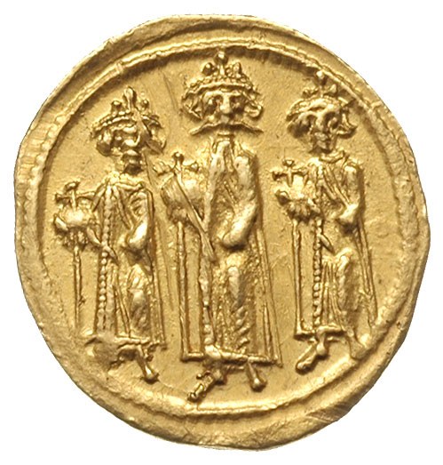 BIZANCJUM, Herakliusz, Herakliusz Konstantyn i Heraklonas 610-641, solidus 637-638, Konstantynopol, oficyna Γ, Aw: Postacie trzech cesarzy na wprost, Rw: Krzyż na czterostopniowej podstawie, po bokach monogramy, VICTORIA AVGG Γ / CONOB, złoto 4.41 g, Sear 764, MIB 45, DOC 39b, rysy na rewersie, ale ładny egzemplarz