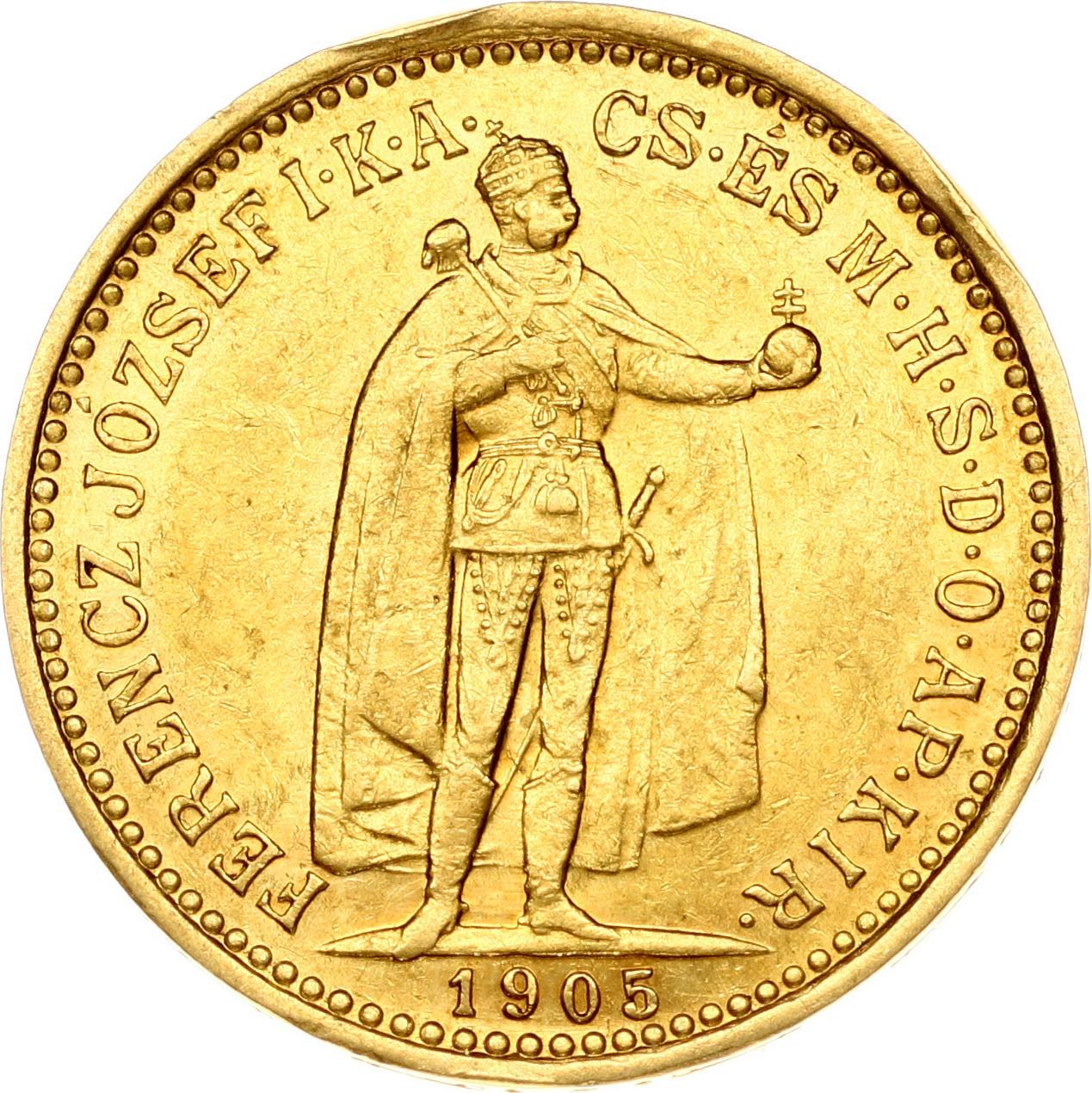 Hungary 10 Korona 1905KB Joseph I(1848-1916). Obverse: Emperor standing. Reverse: Crowned shield with angel supporters. Gold 3.36g. KM 485