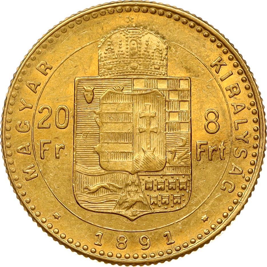 Hungary. Franz Joseph I (1848-1916). 20 Francs / 8 Forint 1891 KB. Gold 6.44 g. KM 477.