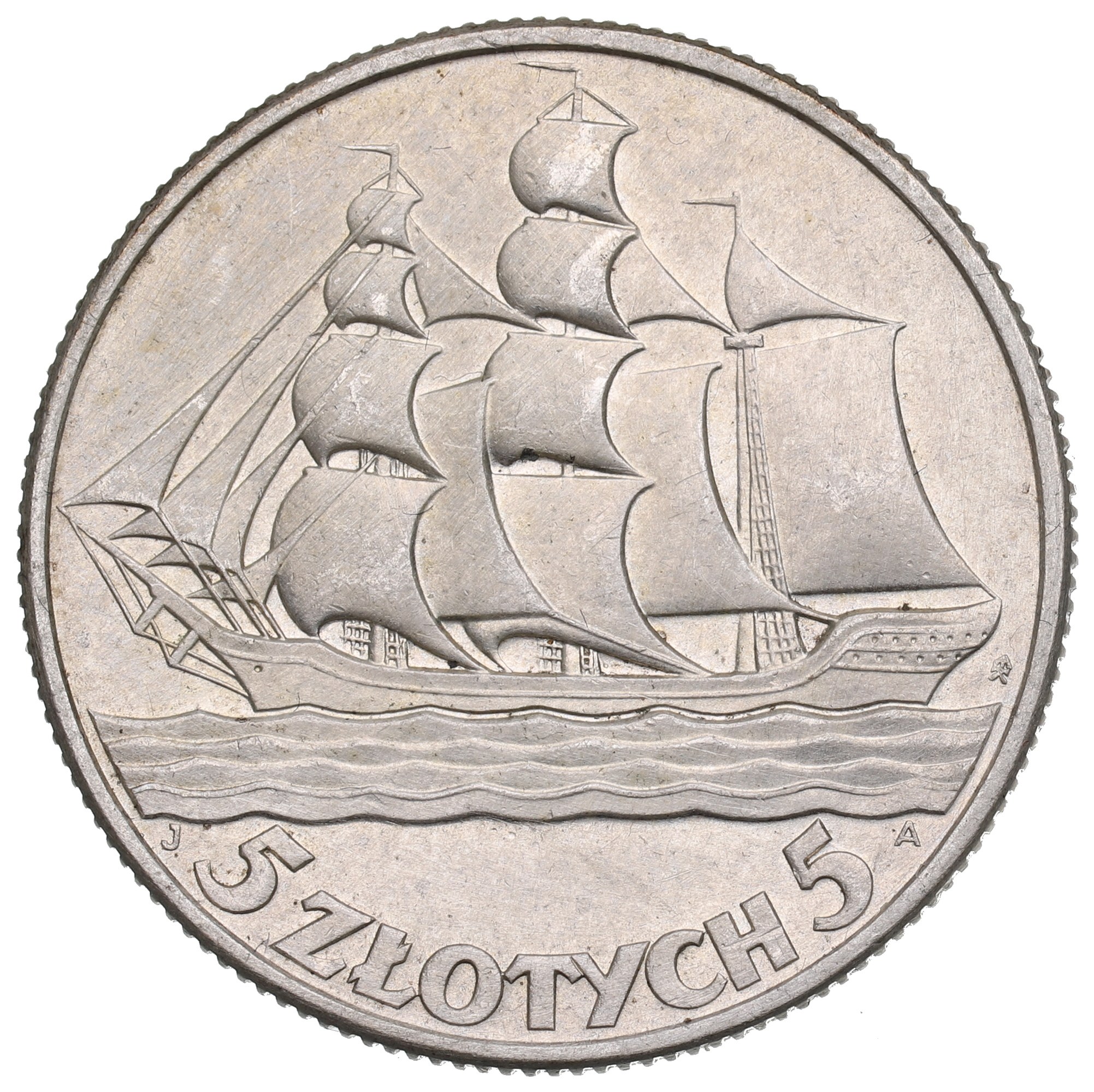 Rewers: widok okrętu na morzu, niżej napis 5 ZŁOTYCH 5, inicjały projektanta J-A. Nad falami, po prawej herb Kościesza – znak Mennicy Państwowej w Warszawie.