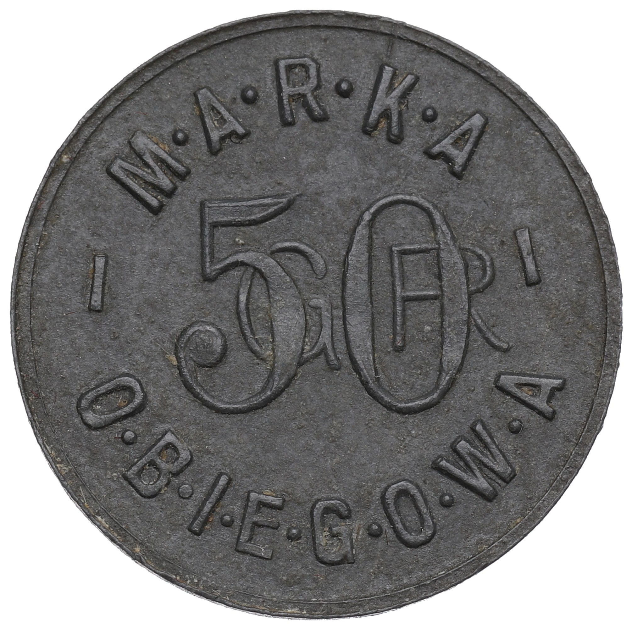 Rewers: wiązane oznaczenie nominału: 50 GR, w otoku M•A•R•K•A/O•B•I•E•G•O•W•A;
