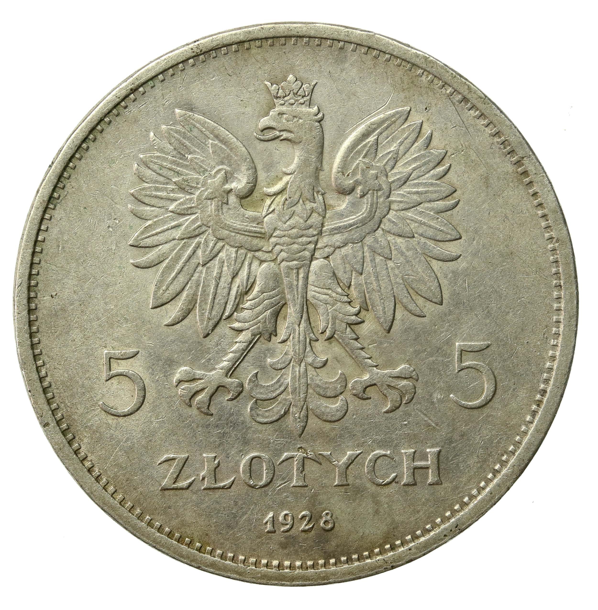 II RP, 5 złotych 1928, Nike, BZM. Stan zachowania: 2-/2. Dobrze zachowana moneta z połyskiem. Literatura: Parchimowicz 114b