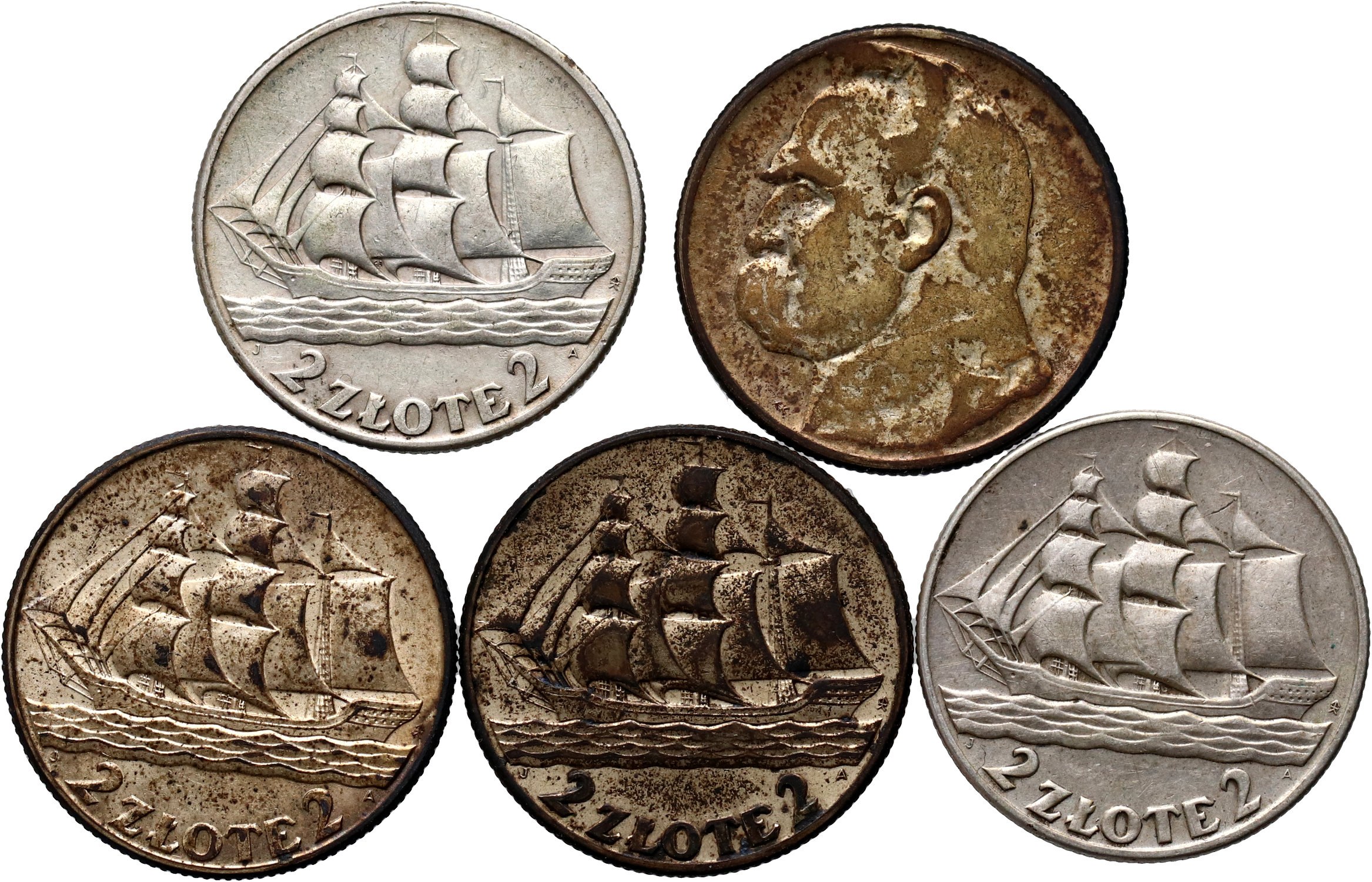 II RP, zestaw, 4 x 5 złotych 1936 Żaglowiec i 2 złote 1934 Piłsudski