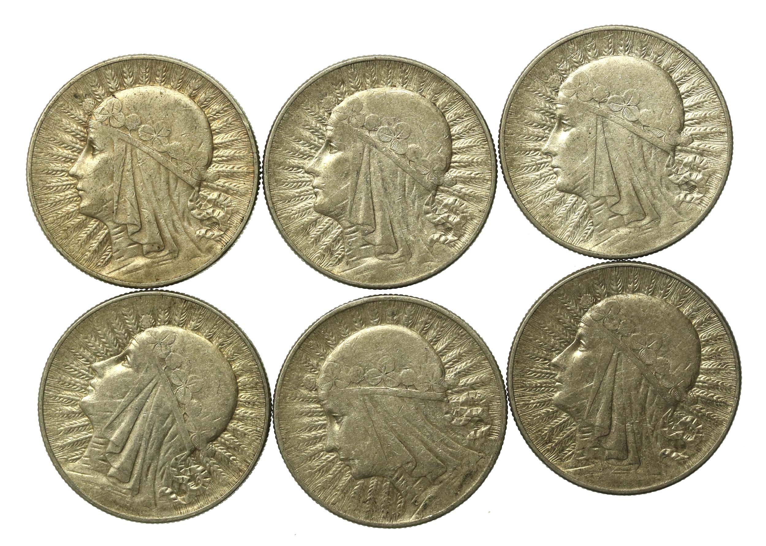 II RP, zestaw 5 złotych 1933-1934 Głowa Kobiety. Razem 6 szt.