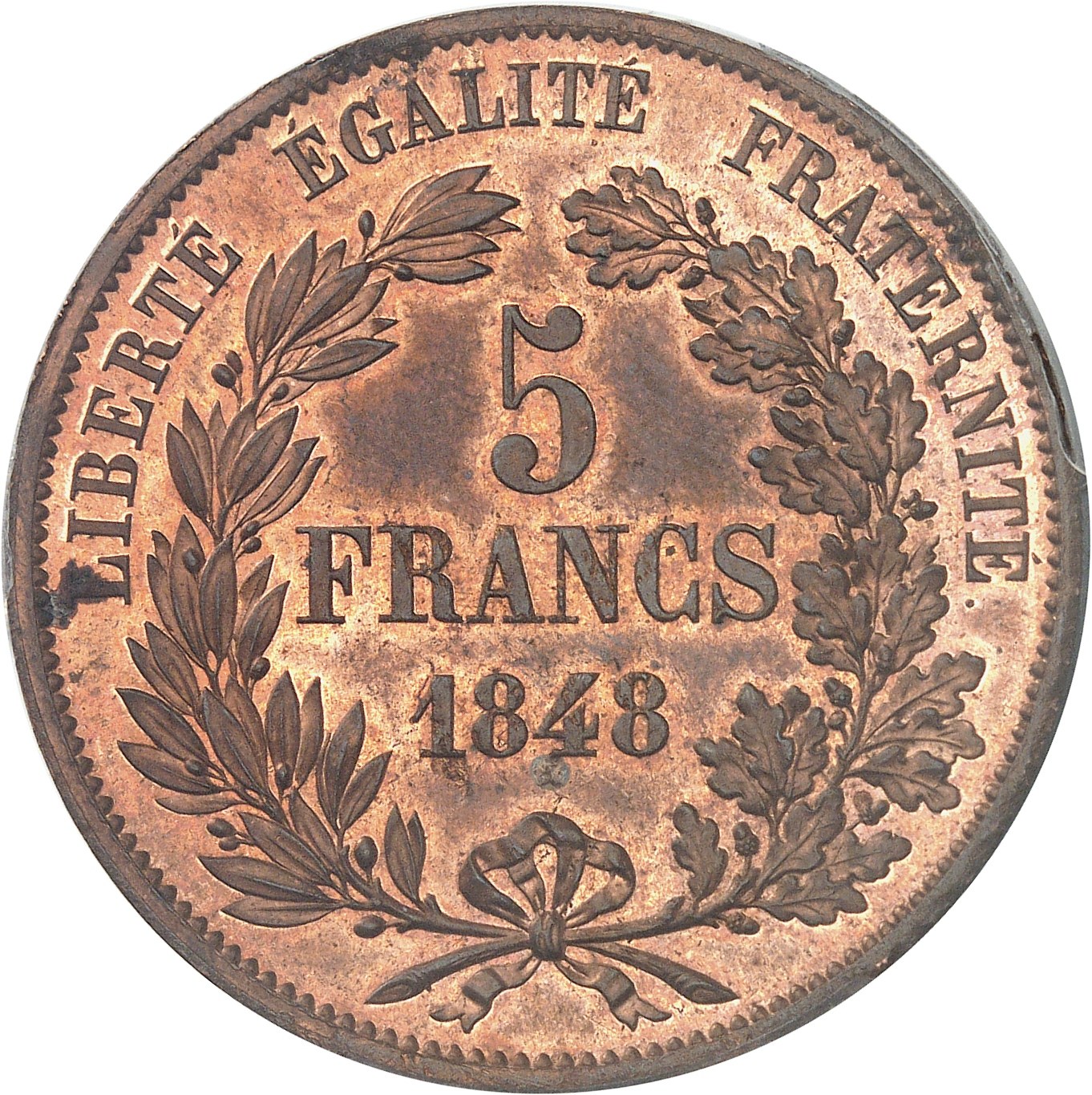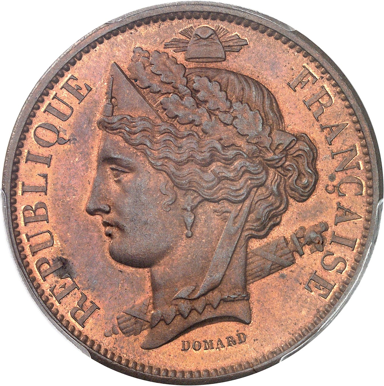 IIe République (1848-1852). Essai de 5 francs, sur flan en cuivre, concours de 1848, par Domard, Frappe spéciale (SP) 1848, Paris. PCGS SP64RB (49097063).