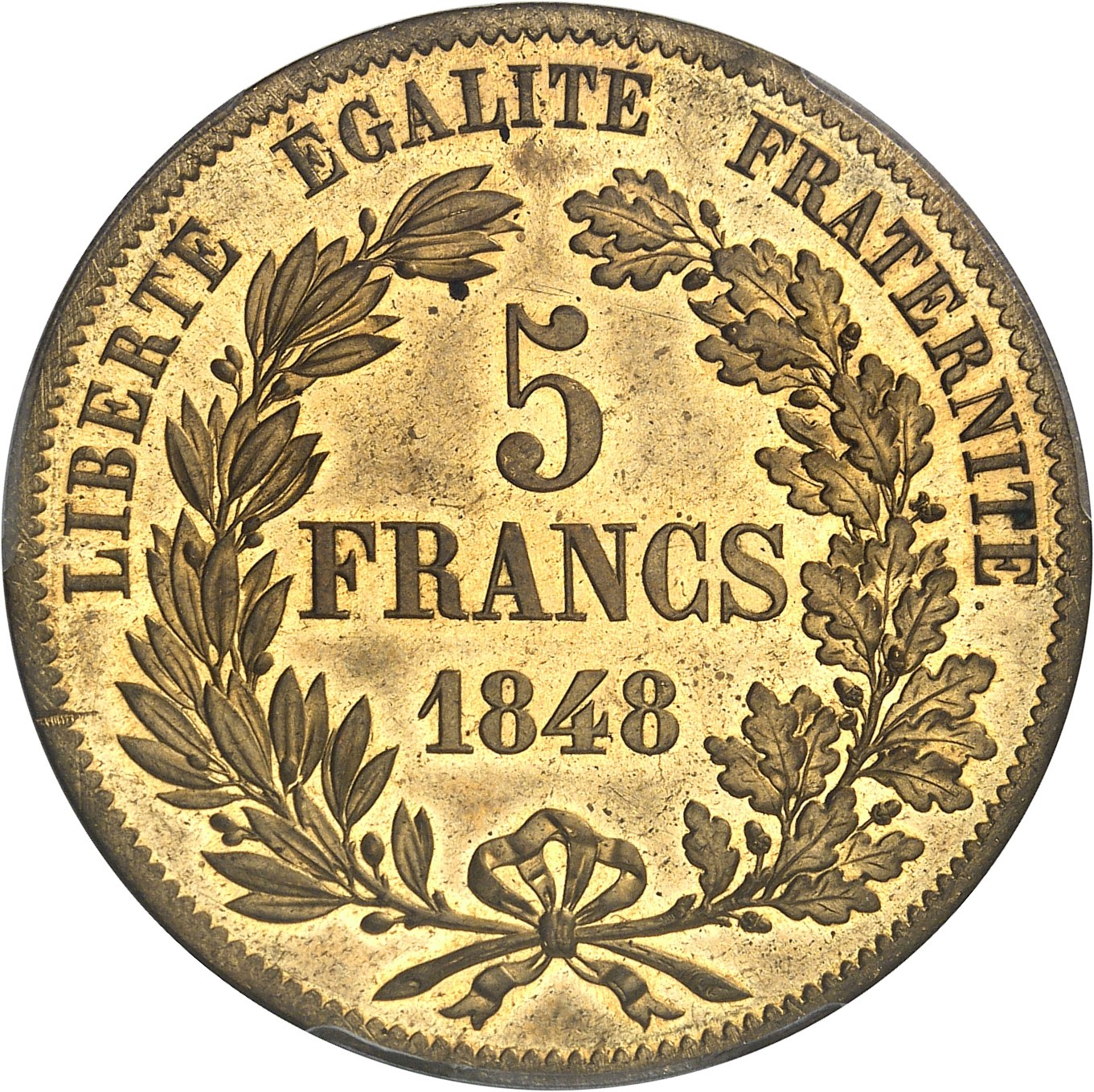 IIe République (1848-1852). Essai de 5 francs, sur flan en cuivre jaune, concours de 1848, 2e type par Farochon, Frappe spéciale (SP) 1848, Paris. PCGS SP62 (49097062).