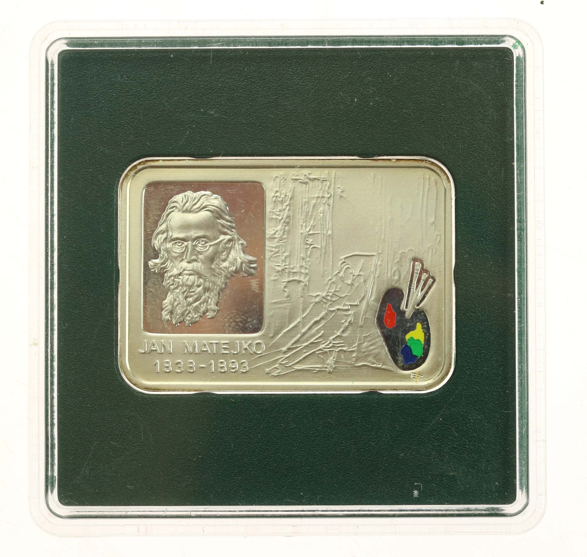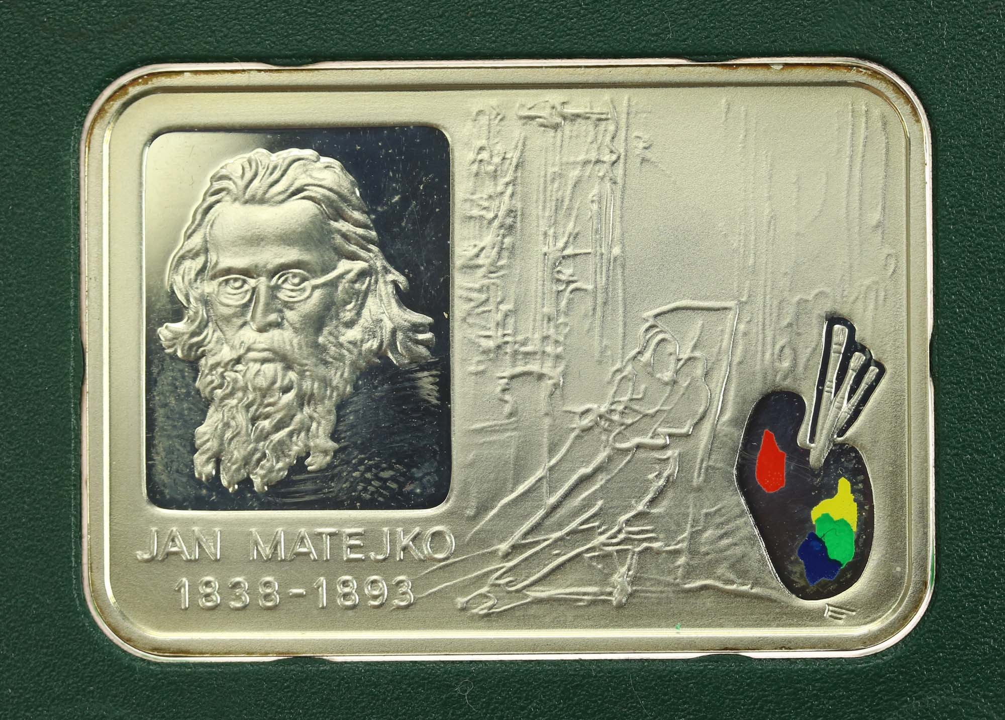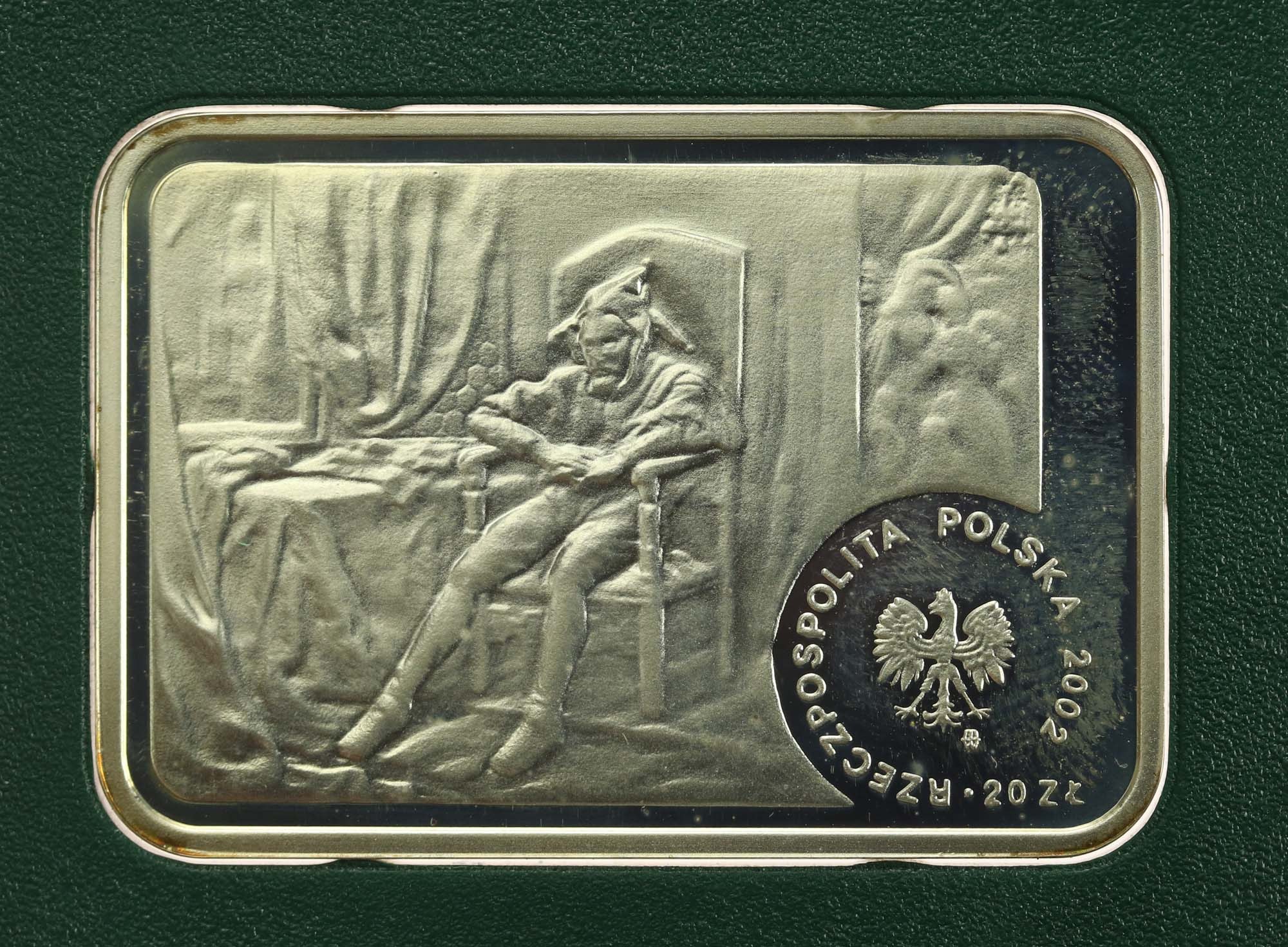 III RP, 20 złotych 2002 Jan Matejko. Moneta wybita stemplem lustrzanym. Srebro próby 925 .Nakład 57.000 sztuk. Stan zachowania L-. Ślady palców. Literatura: Parchimowicz 871
