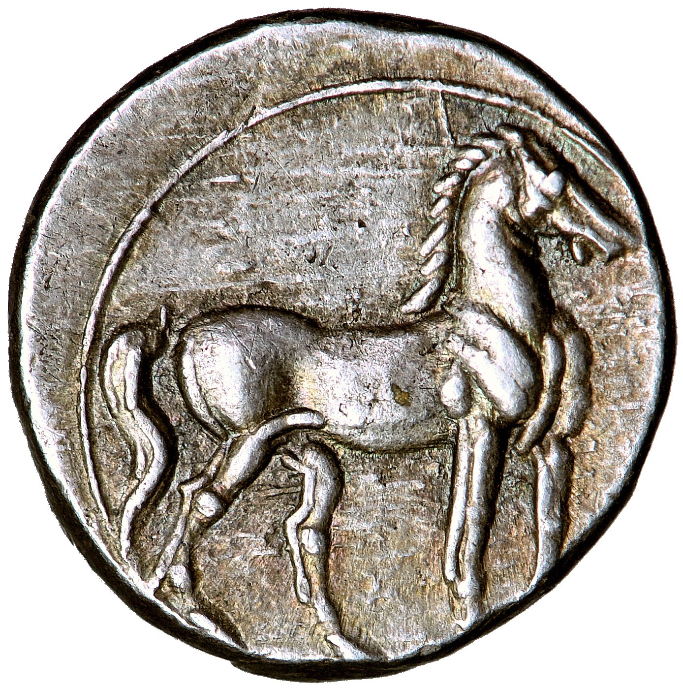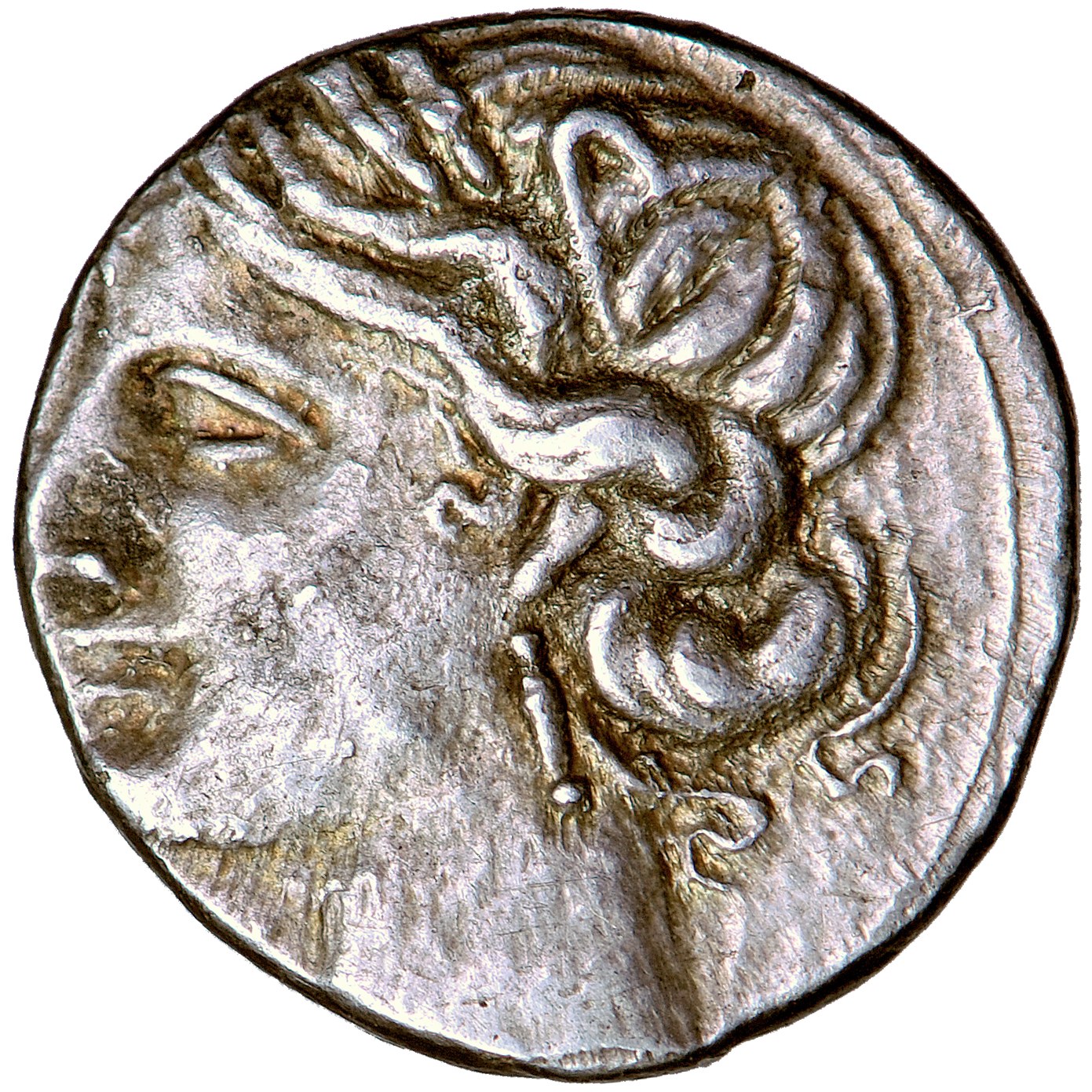 Srebro, 1,73 g, 13,6 mm, oś 11 g. SNG ANS 148-149 (Kapua); SNG COP 336-339.