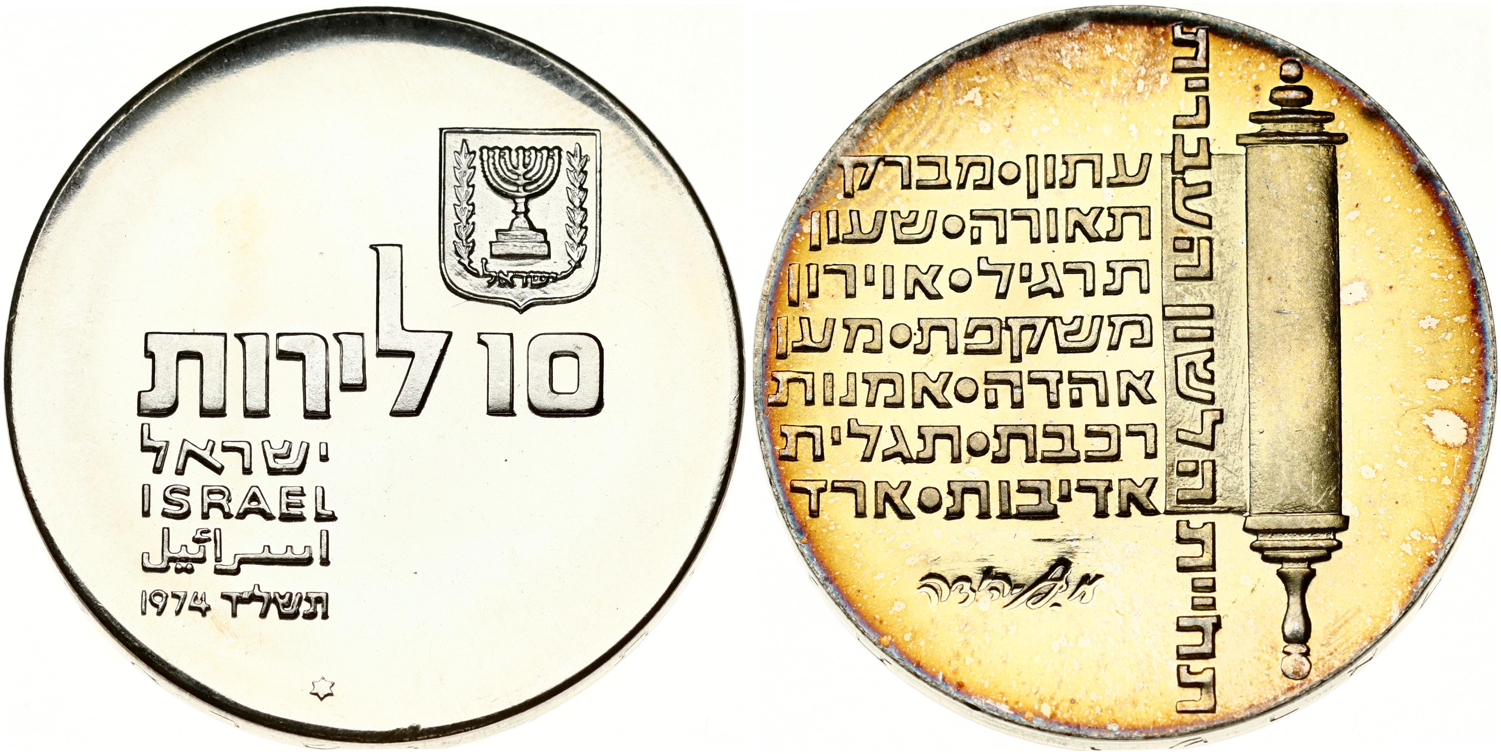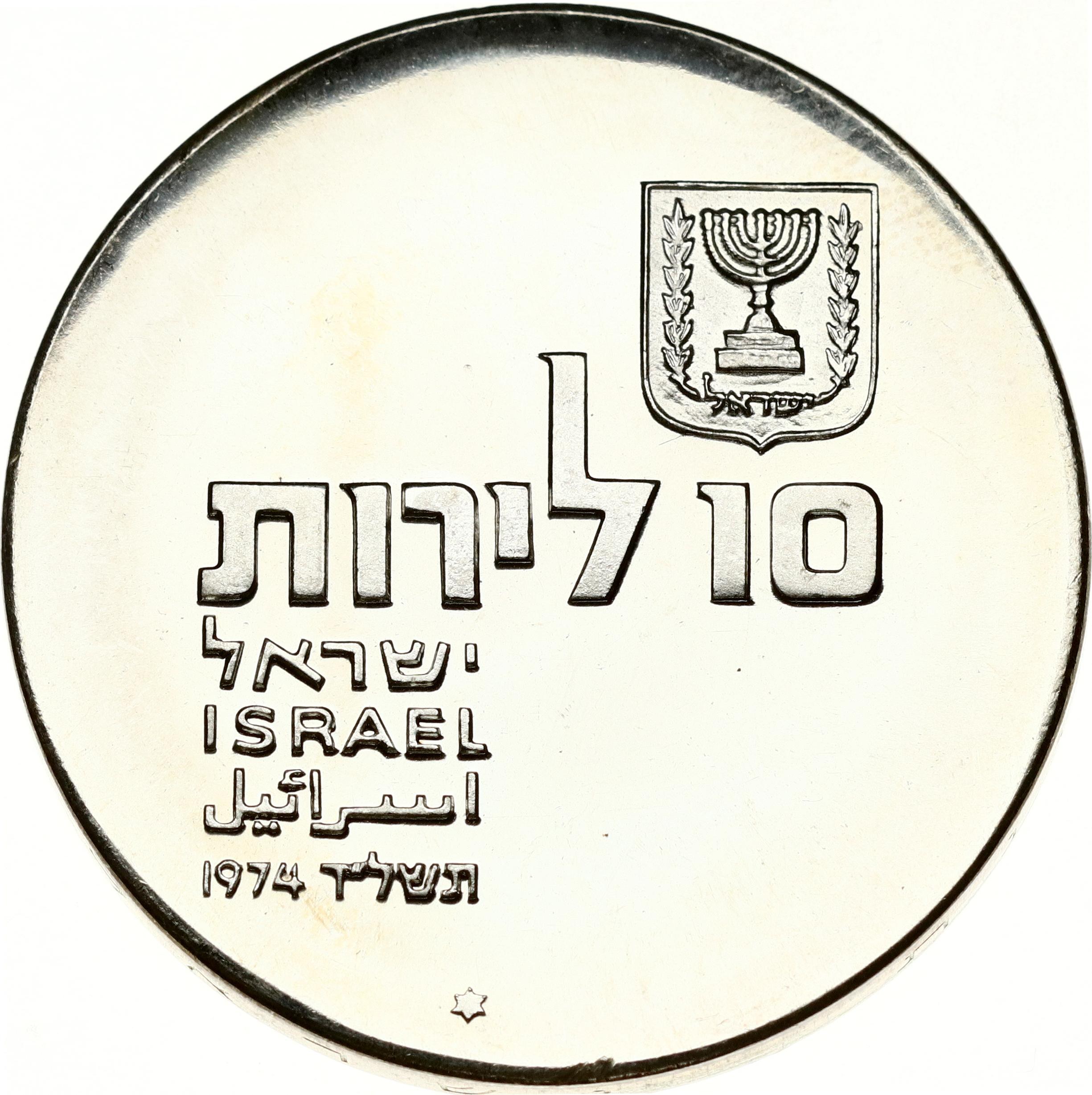 Israel 10 Lirot 5734 (1974) 26th Anniversary of Independence. Obverse: Value at upper right of text. Reverse: Text to left of upright design. Edge Plain with text. Silver (.900) 25.92g. KM-77