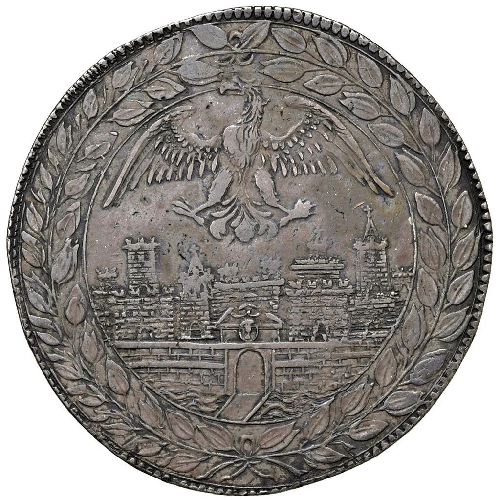 MANTOVA Carlo I Gonzaga Nevers (1627-1637) Scudo anonimo senza data - CNI manca; MIR manca AG (g 26,30) RRRRR Probabilmente tre esemplari noti di questa affascinante moneta, anonima, ma sicuramente da attribuire a Mantova al periodo di incertezza politica dovuta alla contrastata successione al Ducato quando si fronteggiarono Carlo Gonzaga e l'imperatore che non lo voleva in quanto alleato francese. Si tratta di una moneta di grande valore storico ed estremamente affascinante, oltre che rara