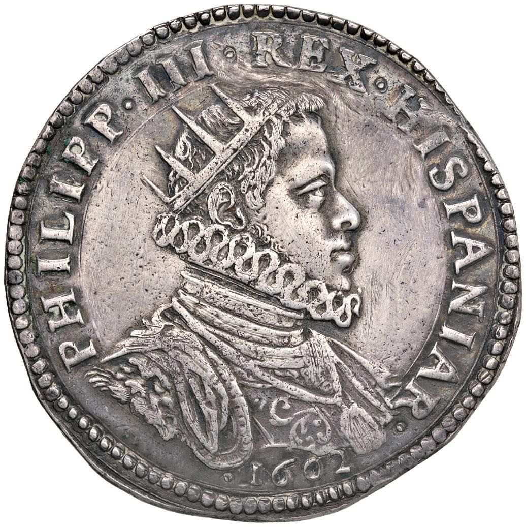 MILANO Filippo III (1598-1621) Ducatone 1602 - MIR 340/2 AG (31,88) RRRR Da montatura, ma comunque esemplare di bella apparenza, dal modulo ampio e ben centrato