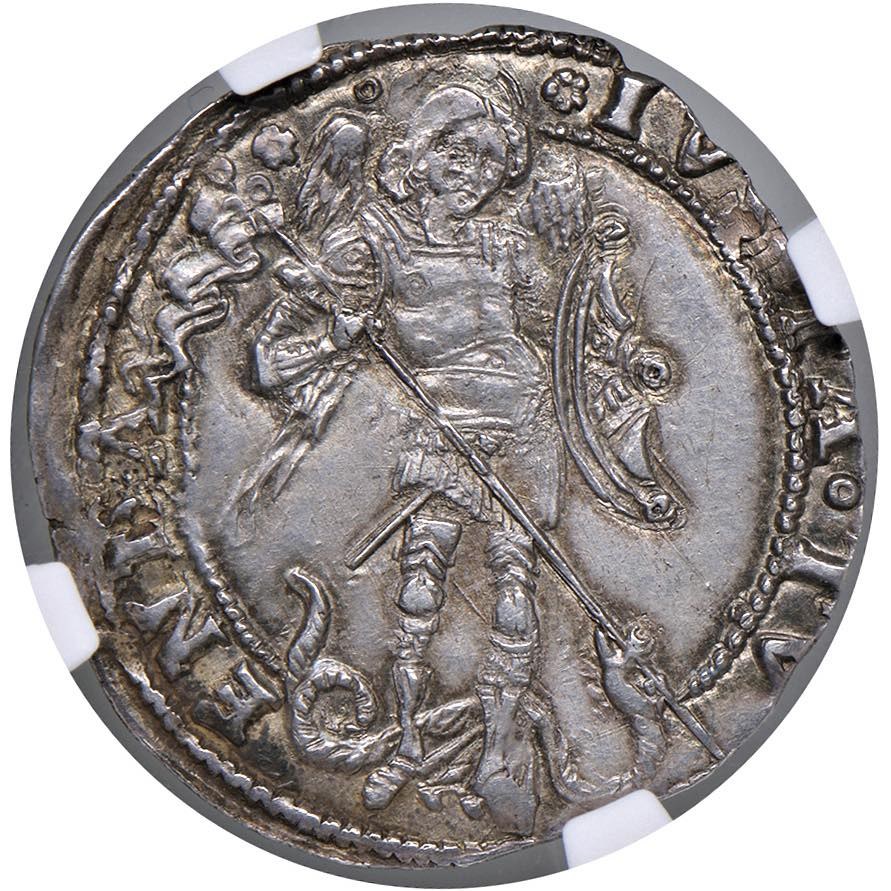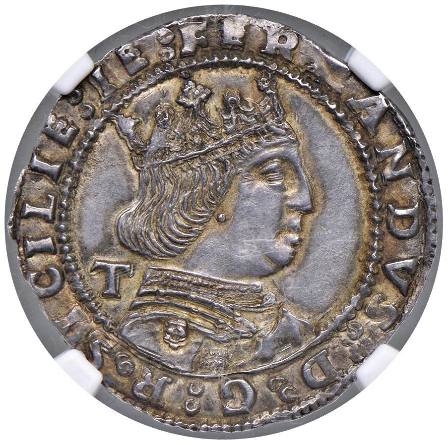 NAPOLI Ferdinando I d'Aragona (1458-1494) Coronato - MIR 69/2 AG (g 3,95) Esemplare in altissima conservazione dai rilievi alti e dettagliati corredati da una splendida patina riposata. In slab NGC AU 58 cod. 8475188-011