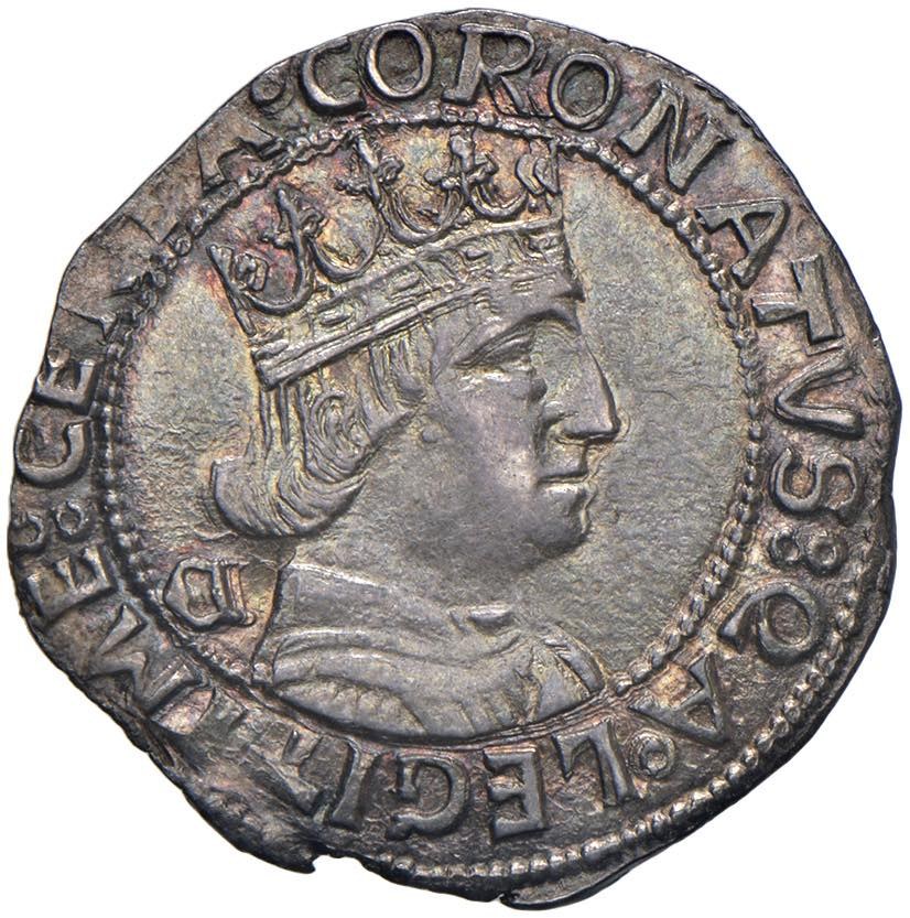 NAPOLI Ferdinando I d'Aragona (1458-1494) Coronato sigla C gotica sotto la croce e dietro il busto - MIR 68/12 AG (g 4,00) Splendido esemplare corredato da una magnifica patina