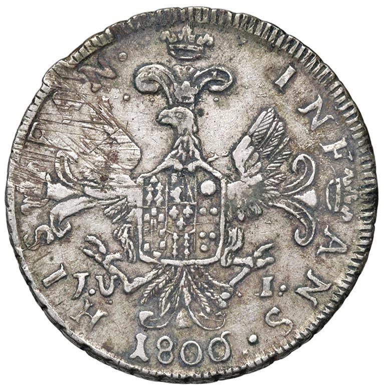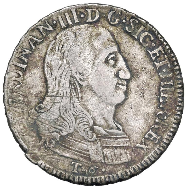PALERMO Ferdinando III (1759-1816) 6 Tarì 1800 - Serio 277 AG (g 13,64) RR Ultime tre cifre della data su 799. Buona conservazione per il tipo