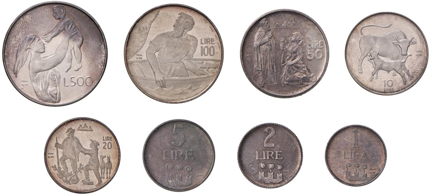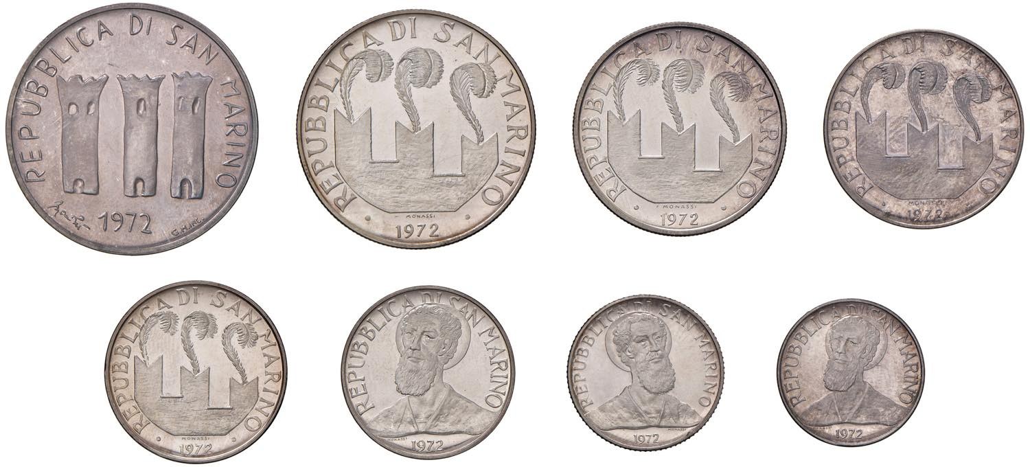 SAN MARINO Divisionale 1972 Prova - AG RRRR Lotto di otto valori: 500, 100, 50, 20, 10, 5, 2 e una lira. Tiratura di sole 70 serie complete. Uno dei pezzi chiave dell'intera serie di San Marino!