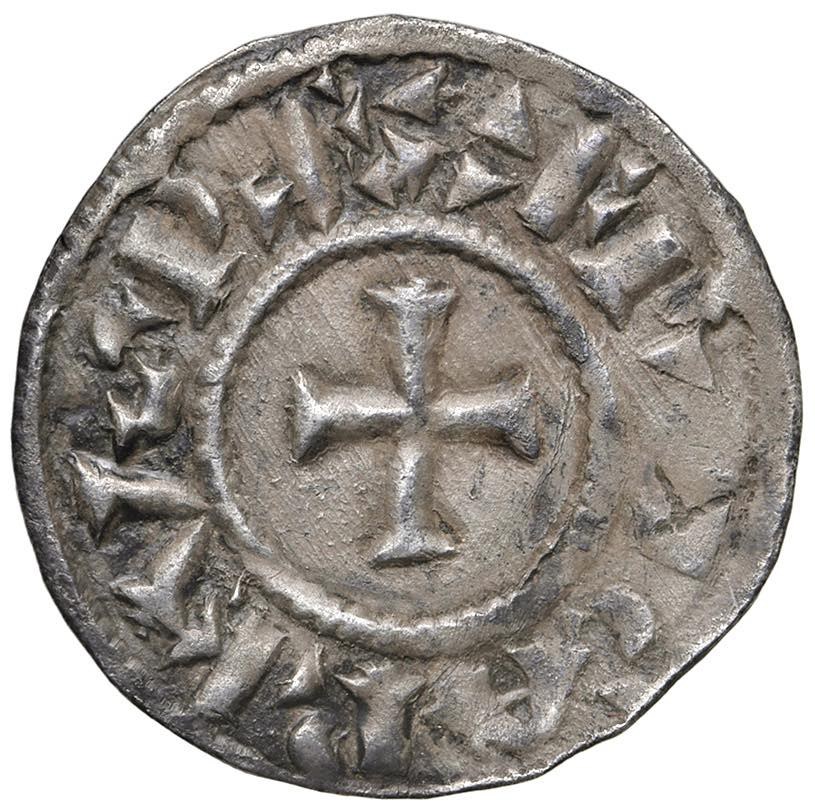 TREVISO Carlo Magno (774-814) Denaro - Biaggi: 2701, Prou:9/2 AG (g 1,61) RRR Splendido esemplare con patina di vecchia raccolta. Interessante variante con un punto all'interno della lettera V in TARVIS