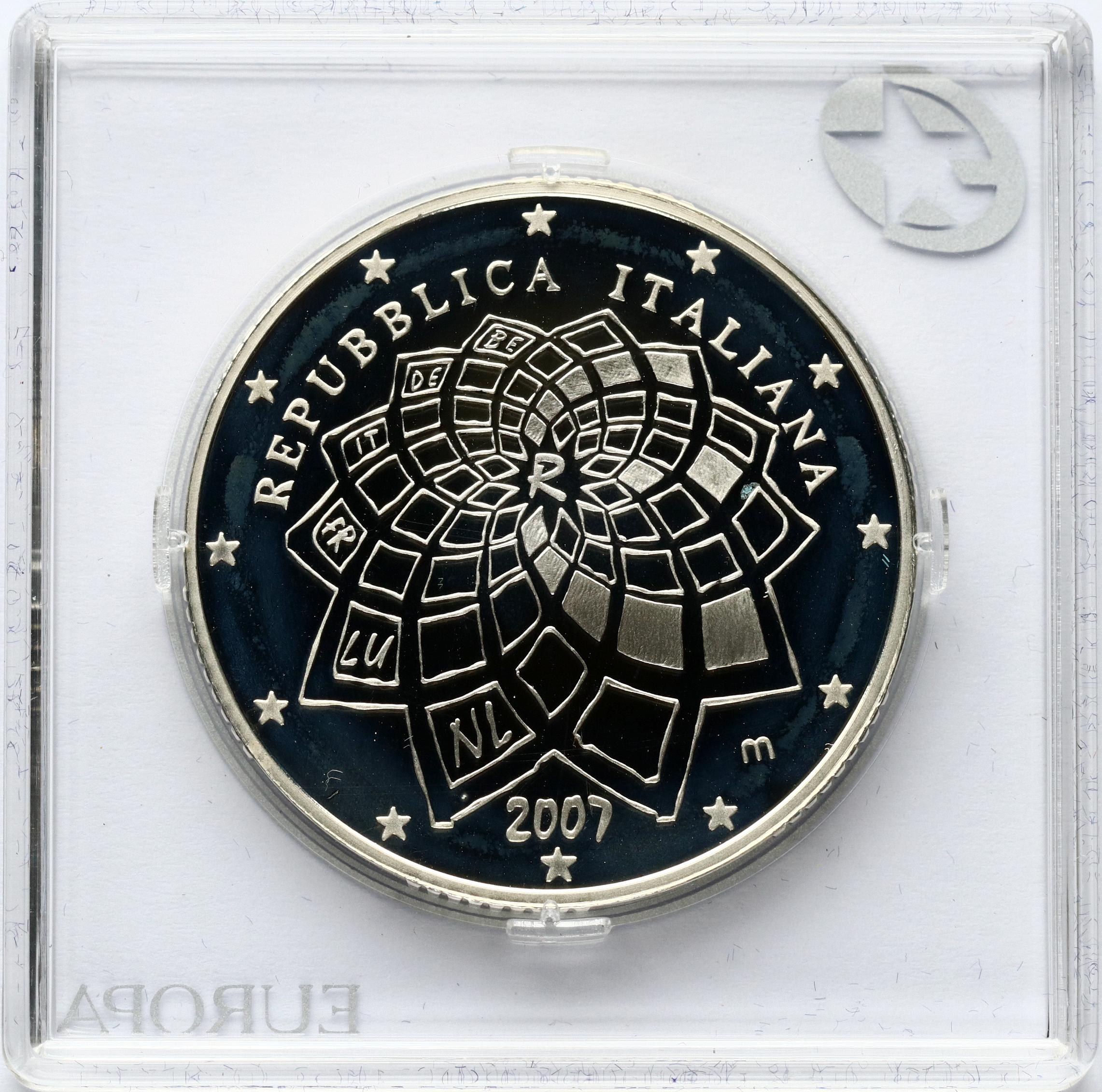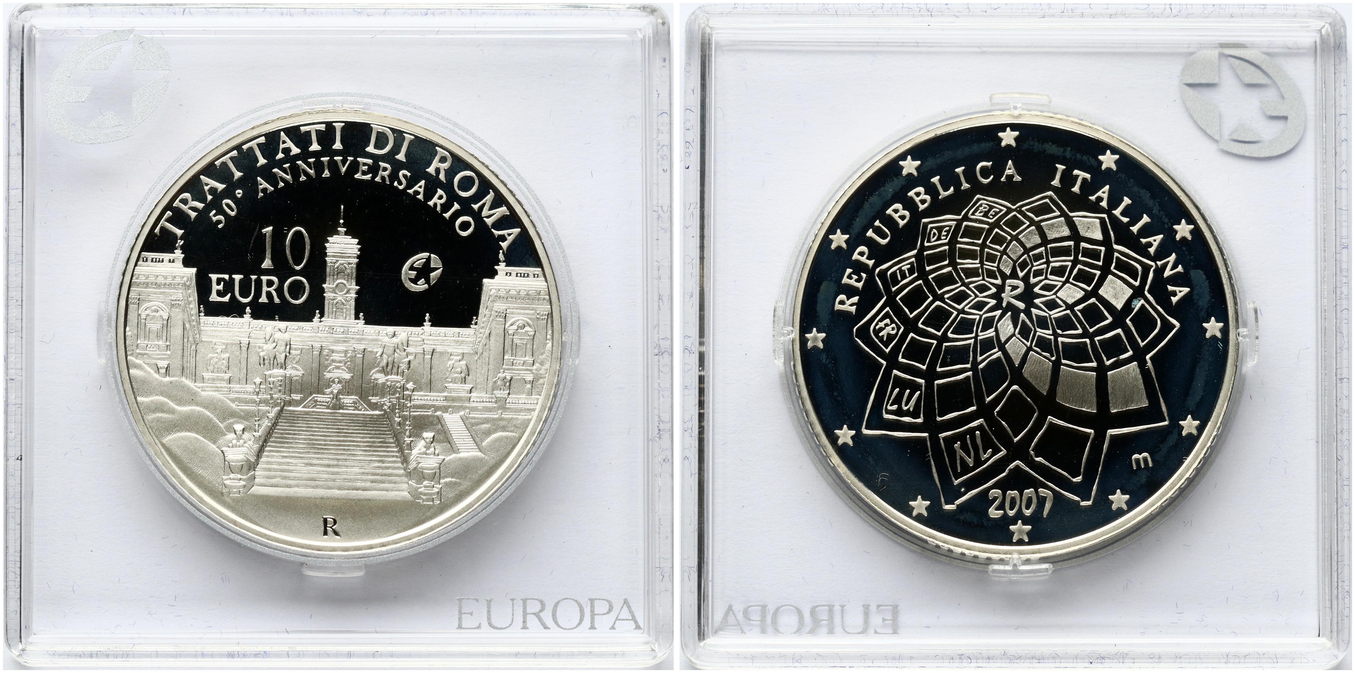 Italy 10 Euro 2007 Treaty of Rome. Obverse Lettering: REPUBBLICA ITALIANA R BE DE IT FR LU NL 2007 m. Reverse: Front view of the Campidoglio Palace in Rome with the well known staircase in foreground. In center; above the Palace; is the Tower of the Paratina with at left the value and at right the Euroset Logo. Mintmark is below; in center. Lettering: TRATTATI DI ROMA 50° ANNIVERSARIO 10 EURO R. Edge Reeded. Silver(.925) 22g. KM 295