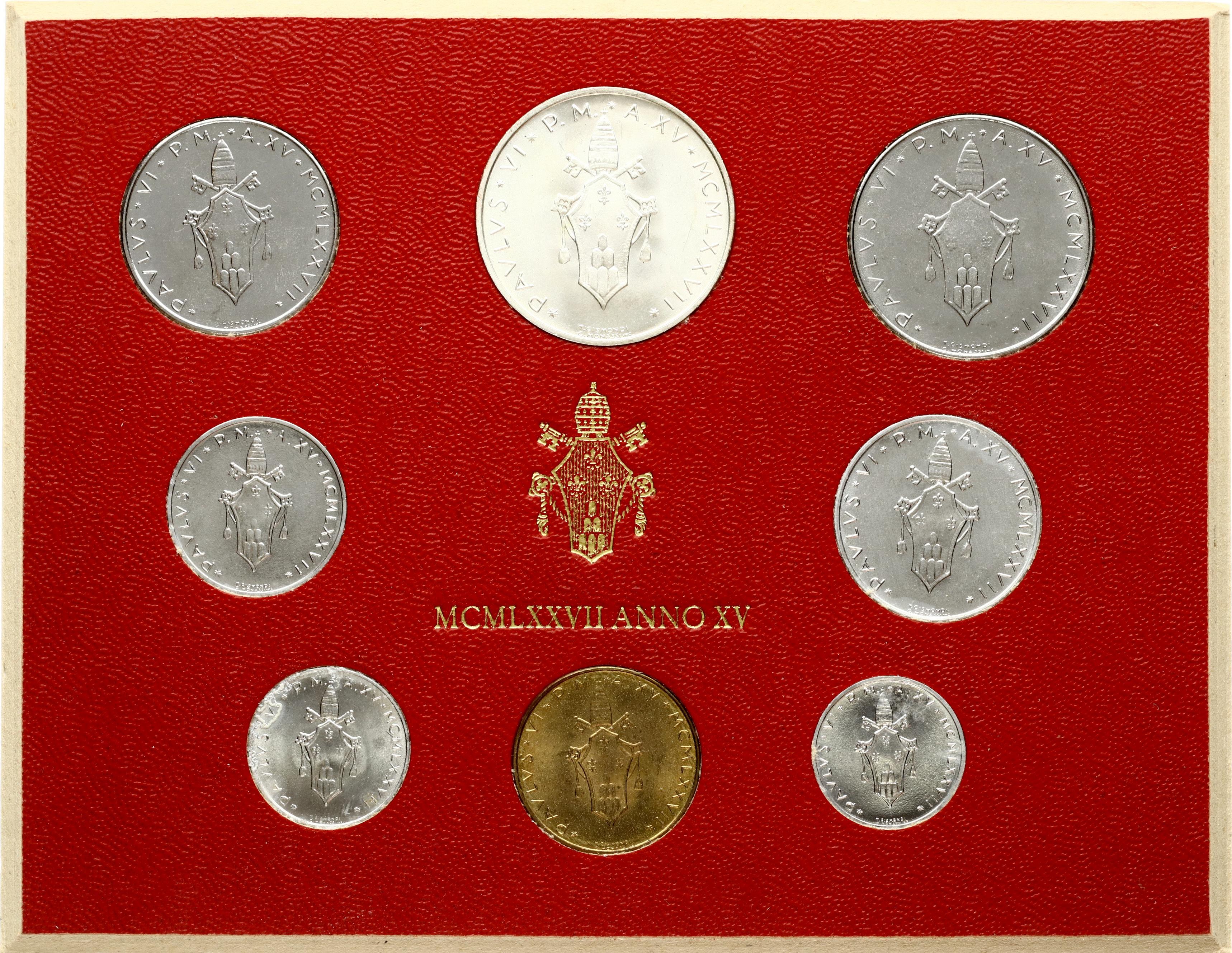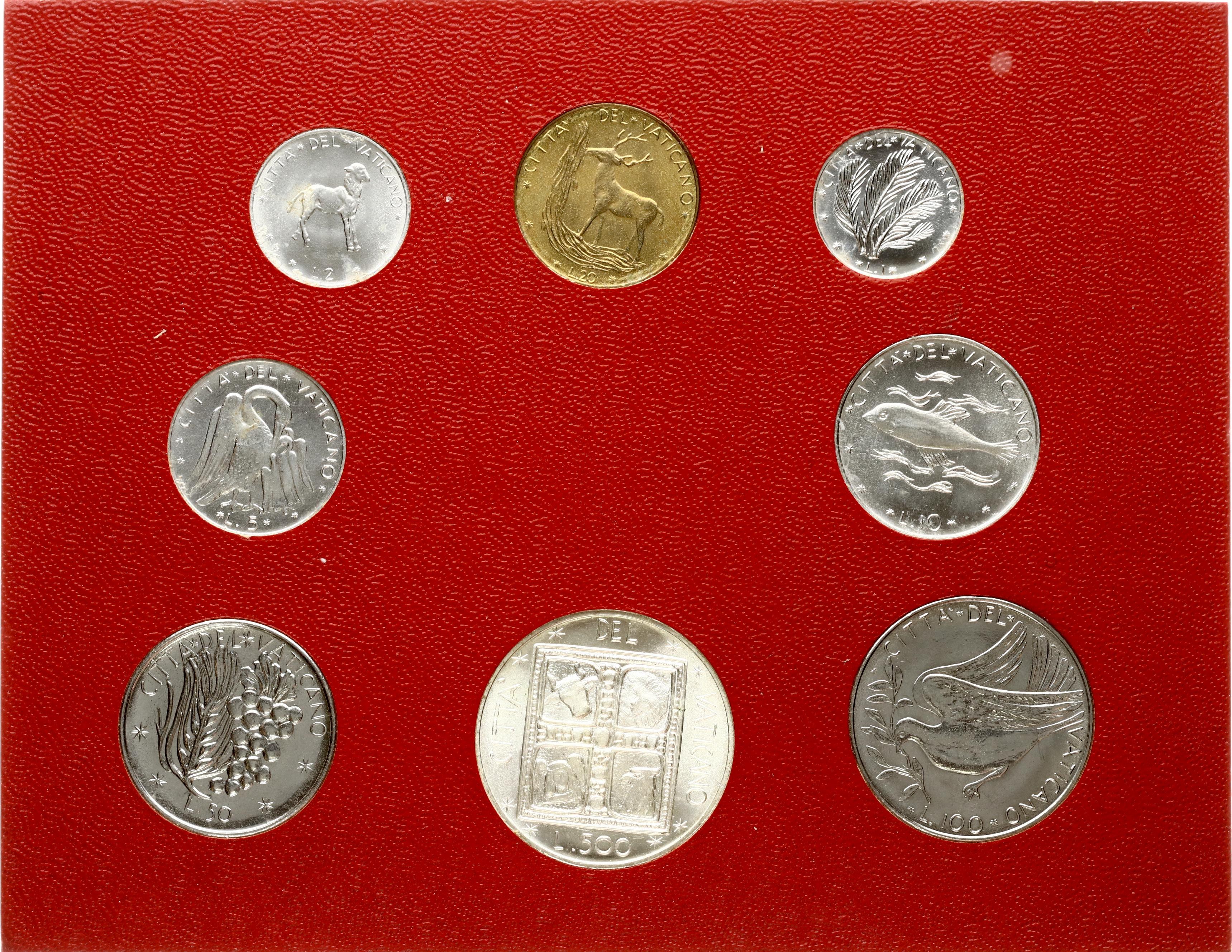 Italy Vatican City 1 - 500 Lire 1977 Set. Paul VI (1963-1978). Book of the Evangelists. Aluminium, Aluminium-bronze, Stainless steel, Silver .835, 11 g. KM-116-132. With Original Pack. Lot of 8 Coins