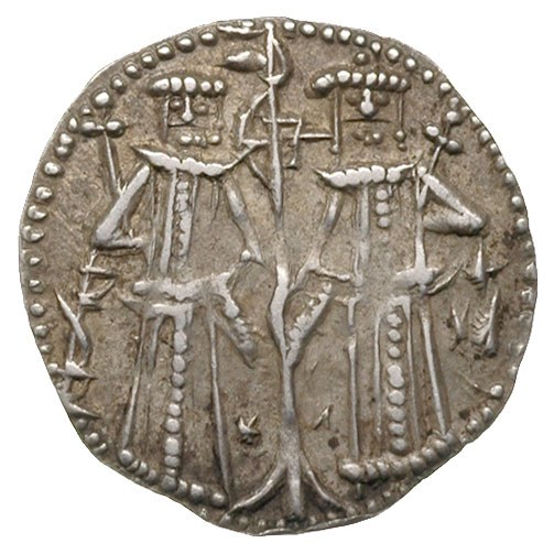BUŁGARIA, Iwan Aleksander 1331-1371, grosz srebrny, Aw: Chrystus stojący na wprost, wznoszący ręce w geście oranta, Rw: Iwan Aleksander i Michał Asen stojący z berłami na wprost, między nimi długi krzyż zakończony znakiem Chrystusa, srebro 1.56 g, Youroukova & Penchev 74-80